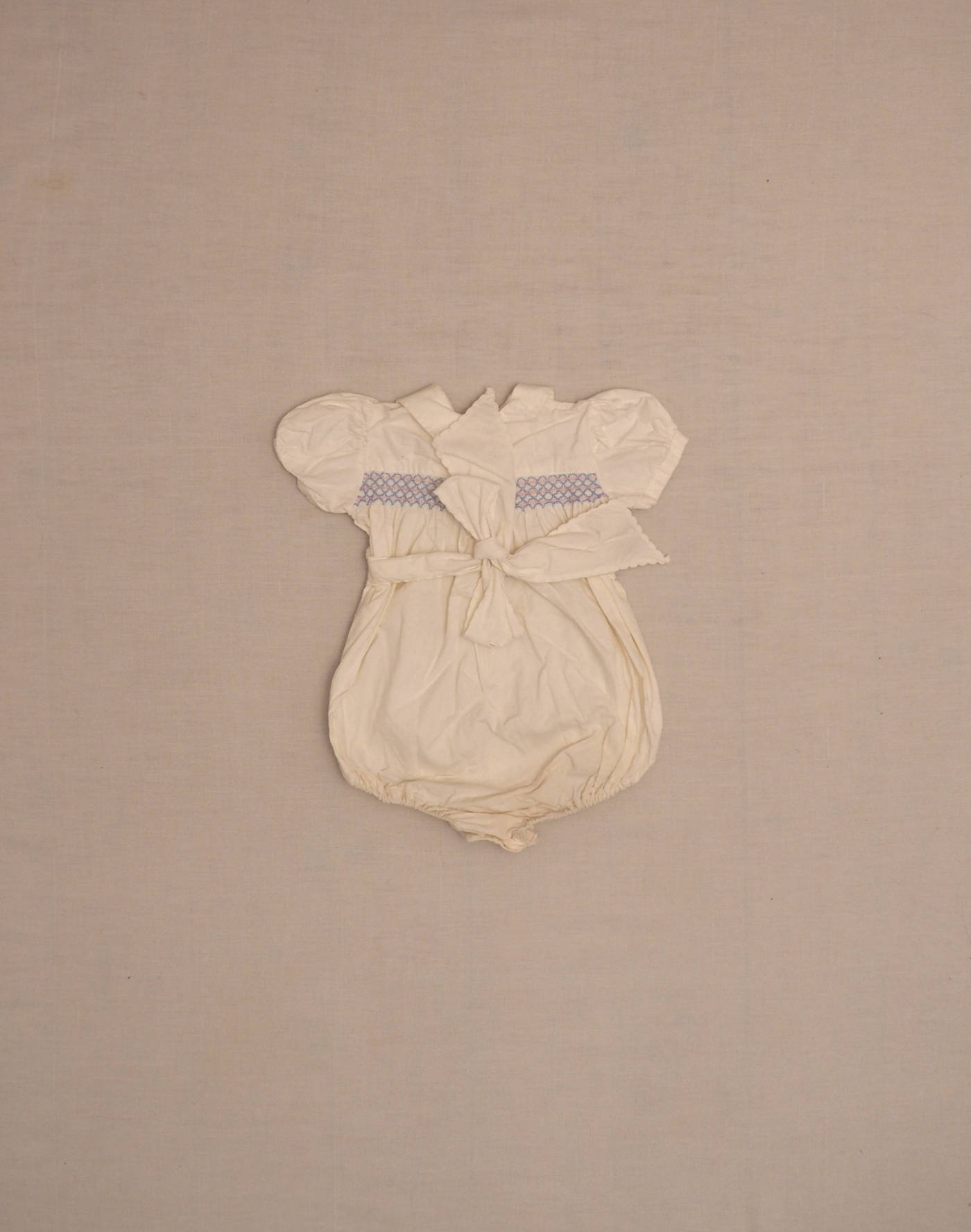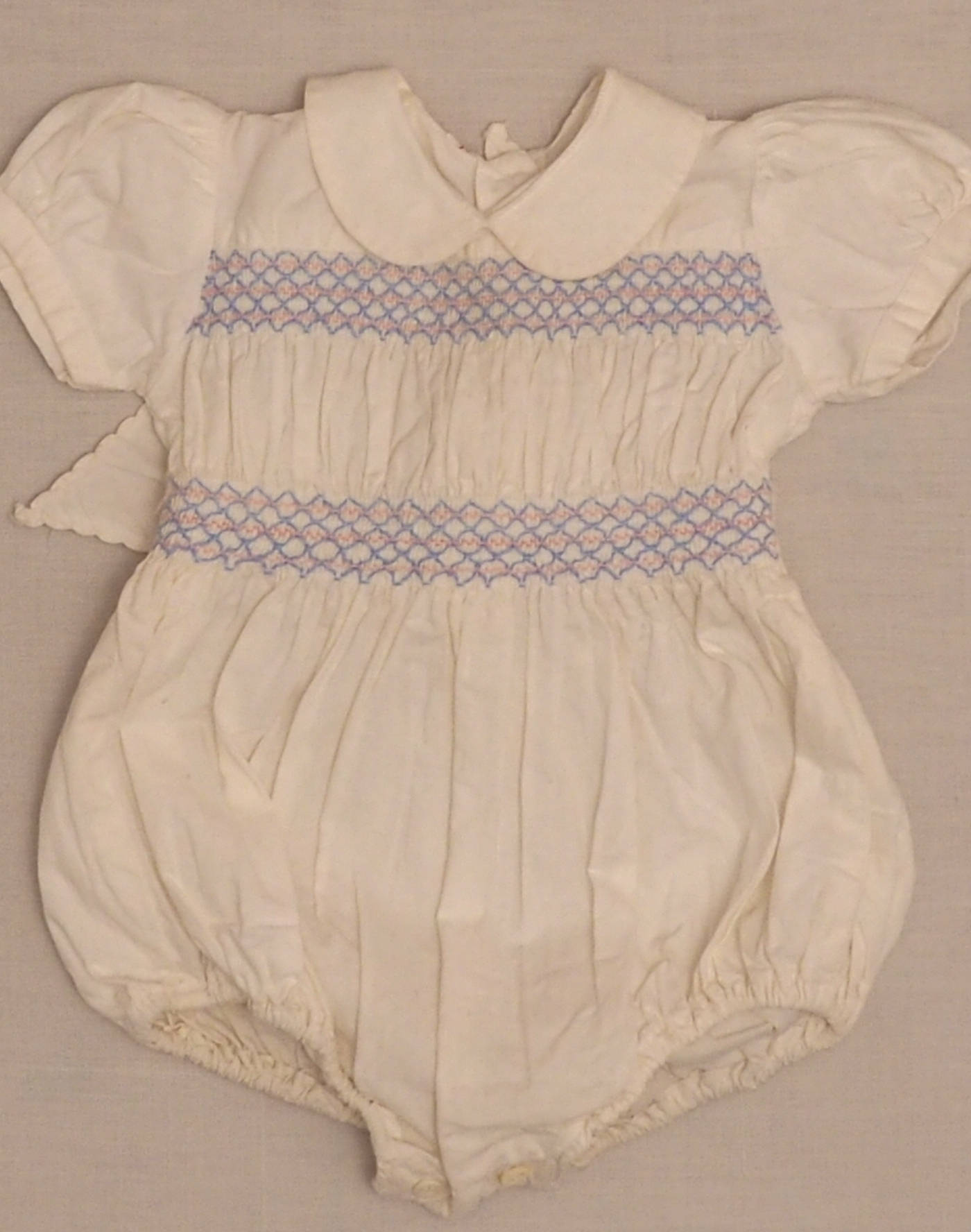 Années 1950 ou un peu avant. Très belle barboteuse à manches courtes ballon avec smocks sur le buste brodés en bleu et rose, effet bloomer sur le bas avec élastiques aux cuisses. Fermée dans le dos par deux boutons et une bride à nouer, deux boutons à l’entrejambe. Très bon état, pas d’étiquette de composition mais coton sans nul doute.
