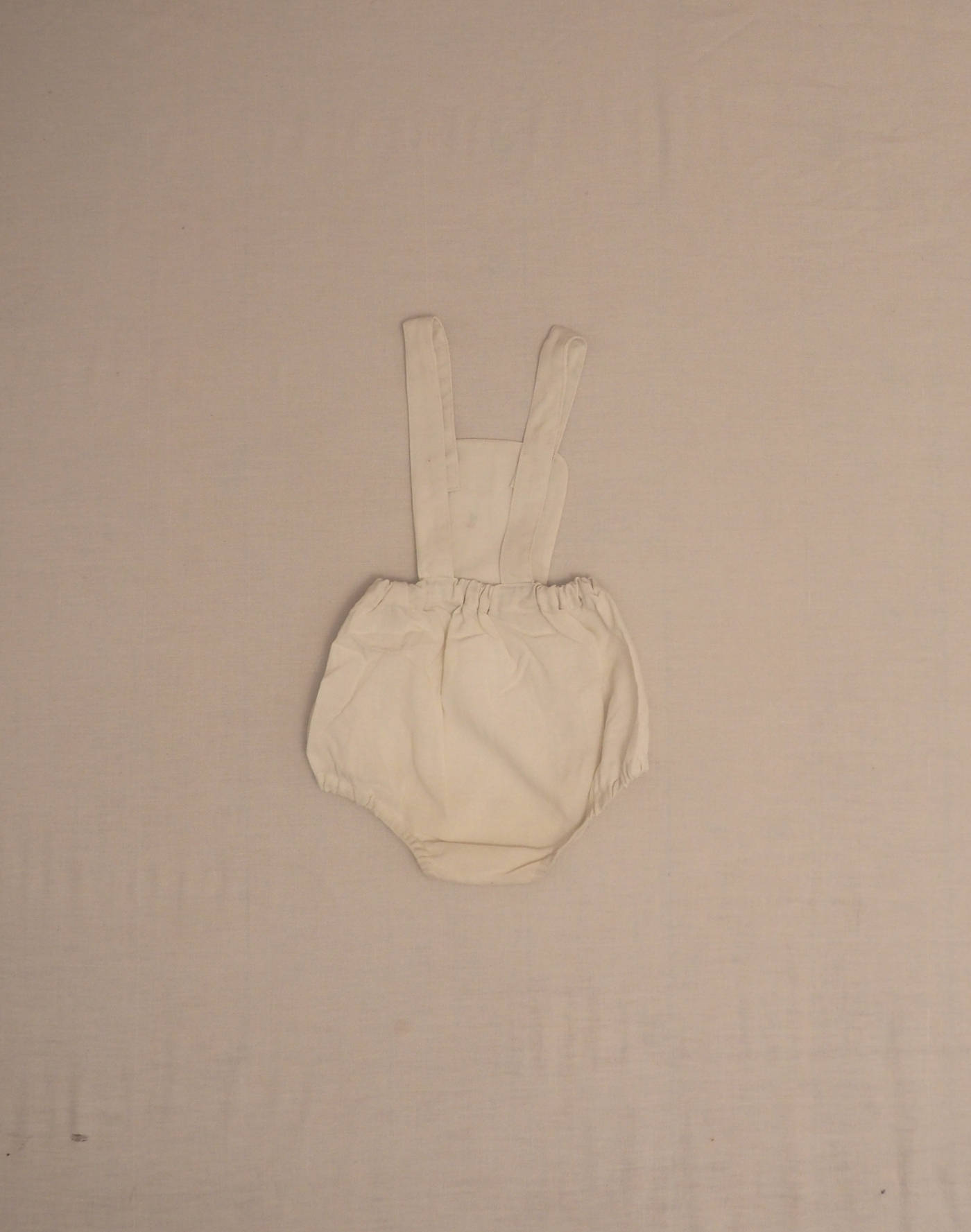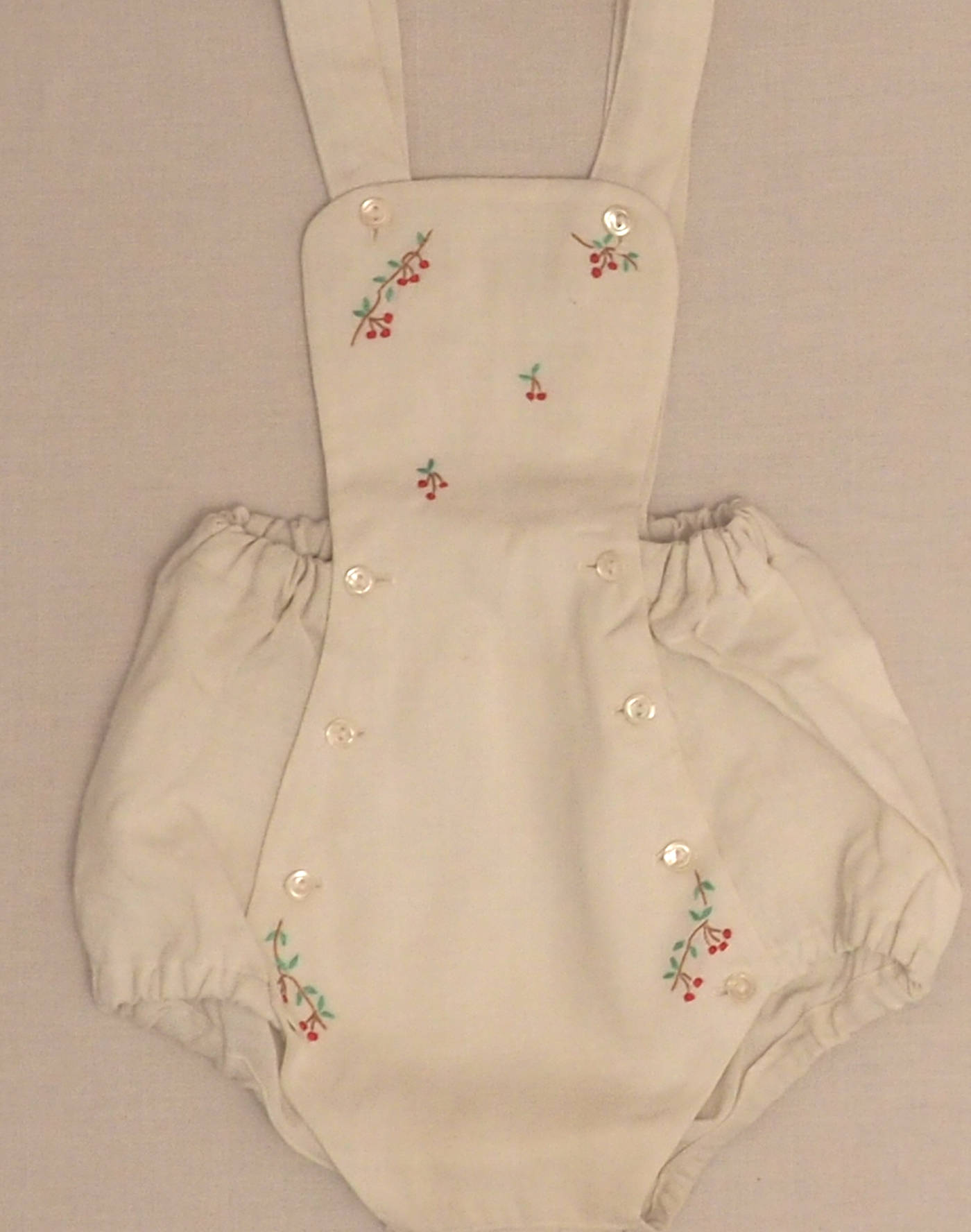 Pièce artisanale. Charmante barboteuse à bretelles blanches, toucher lin ou lin & coton, brodée de petites cerises. Taille élastique et bretelles, fermée devant par dix boutons en vraie nacre. Elastique à la taille et aux cuisses. Très bon état, pièce cousue main donc pas d’étiquette mais toucher lin & coton.
