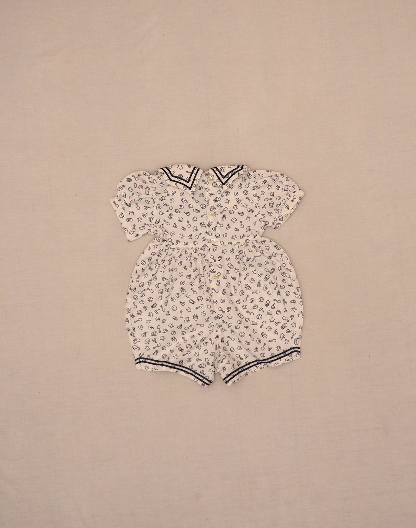 Cacharel vintage. Somptueuse barboteuse short en coton blanc à petits motifs plage bleu marine, grand col orné de deux rubans, manches courtes ballon, effet bloomer sur la taille, rubans sur le bas de jambe. Fermée dans le dos par quatre boutons, quatre boutons pression à l’entrejambe. Fabriquée en France, très bon état, 100% coton.