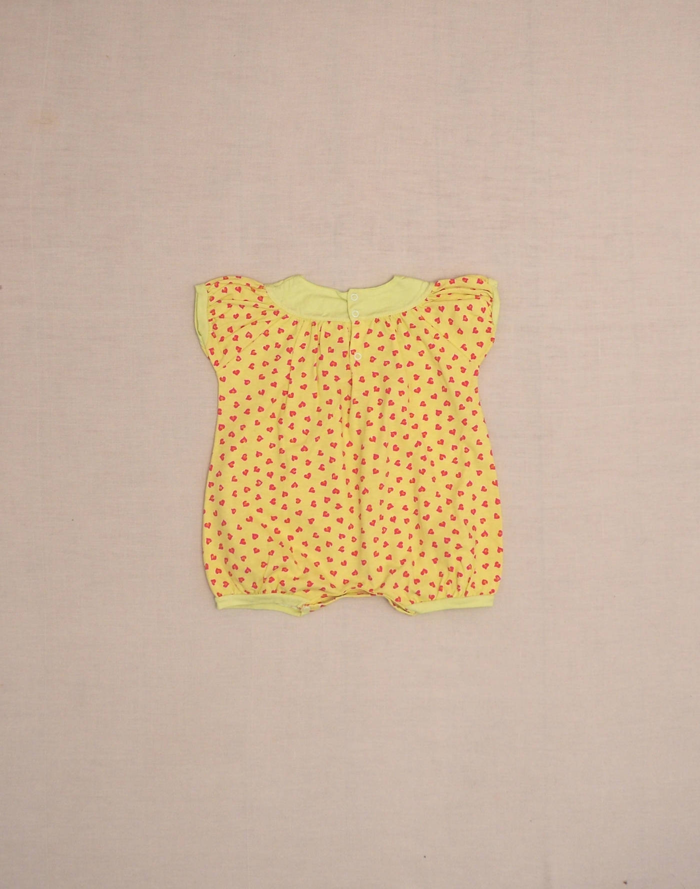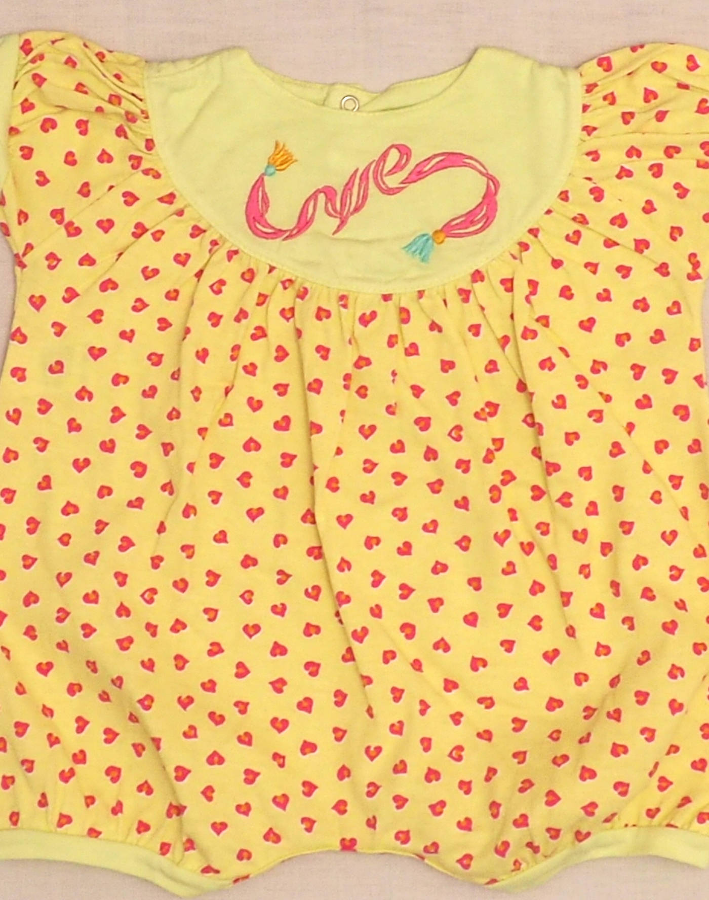 Yves Saint Laurent Enfance, années 1980. Charmante barboteuse en jersey anis avec motif coeurs rose, petit plastron brodé « YSL » en ruban. Plissé sur le buste, fermée par deux boutons pression dans le dos, quatre boutons pression à l’entrejambe. Fabriquée en France, très bon état, 100% coton.
