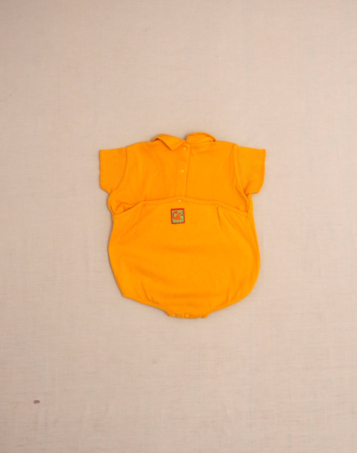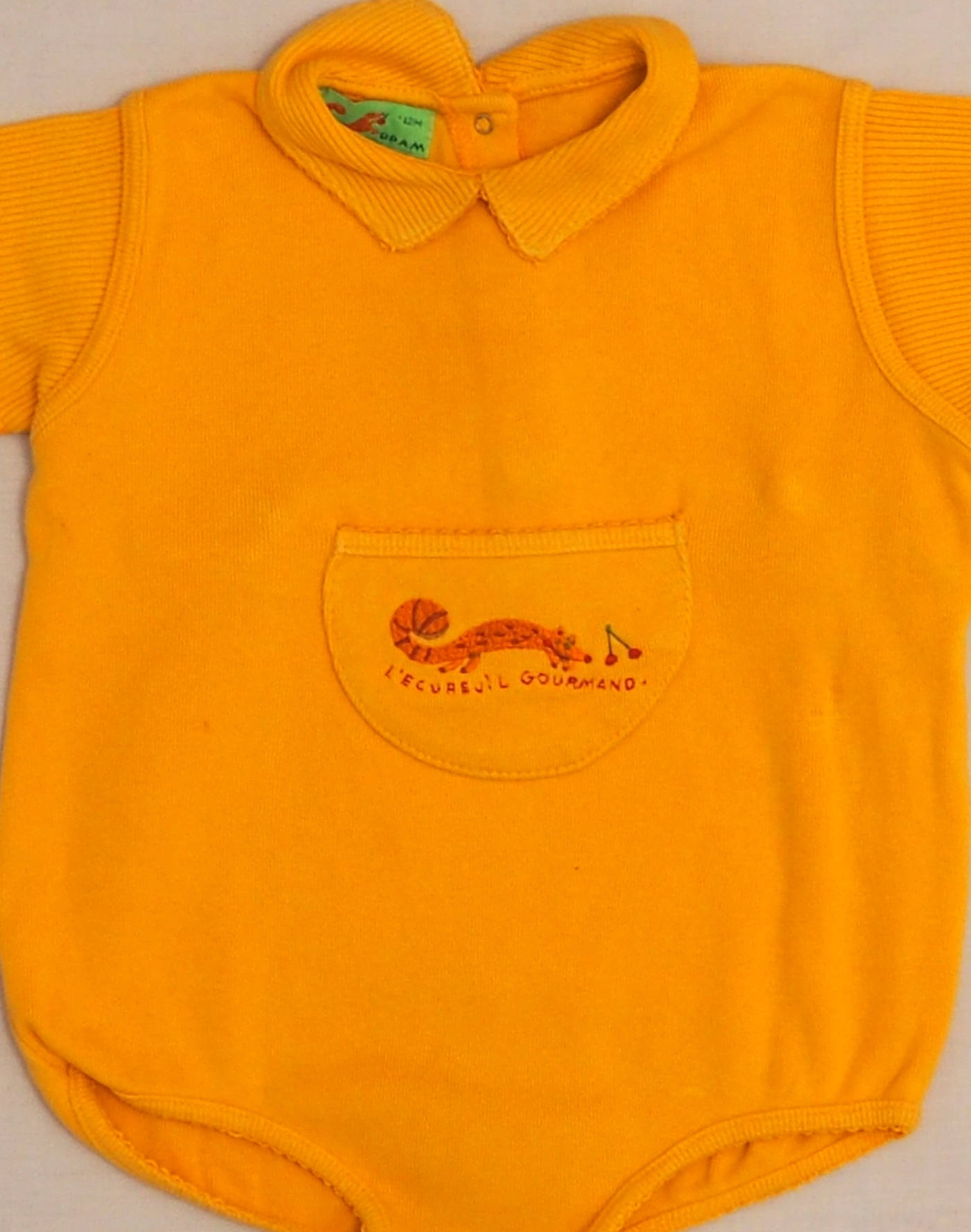Joli barboteuse en jersey jaune safran finement côtelé, coutures brodées, poche plaquée sur le buste brodée d’un écureuil gourmand. Fermée dans le dos par deux boutons pression verticaux, trois boutons pression horizontaux, trois boutons pression à l’entrejambe. Très bon état, 100% coton.