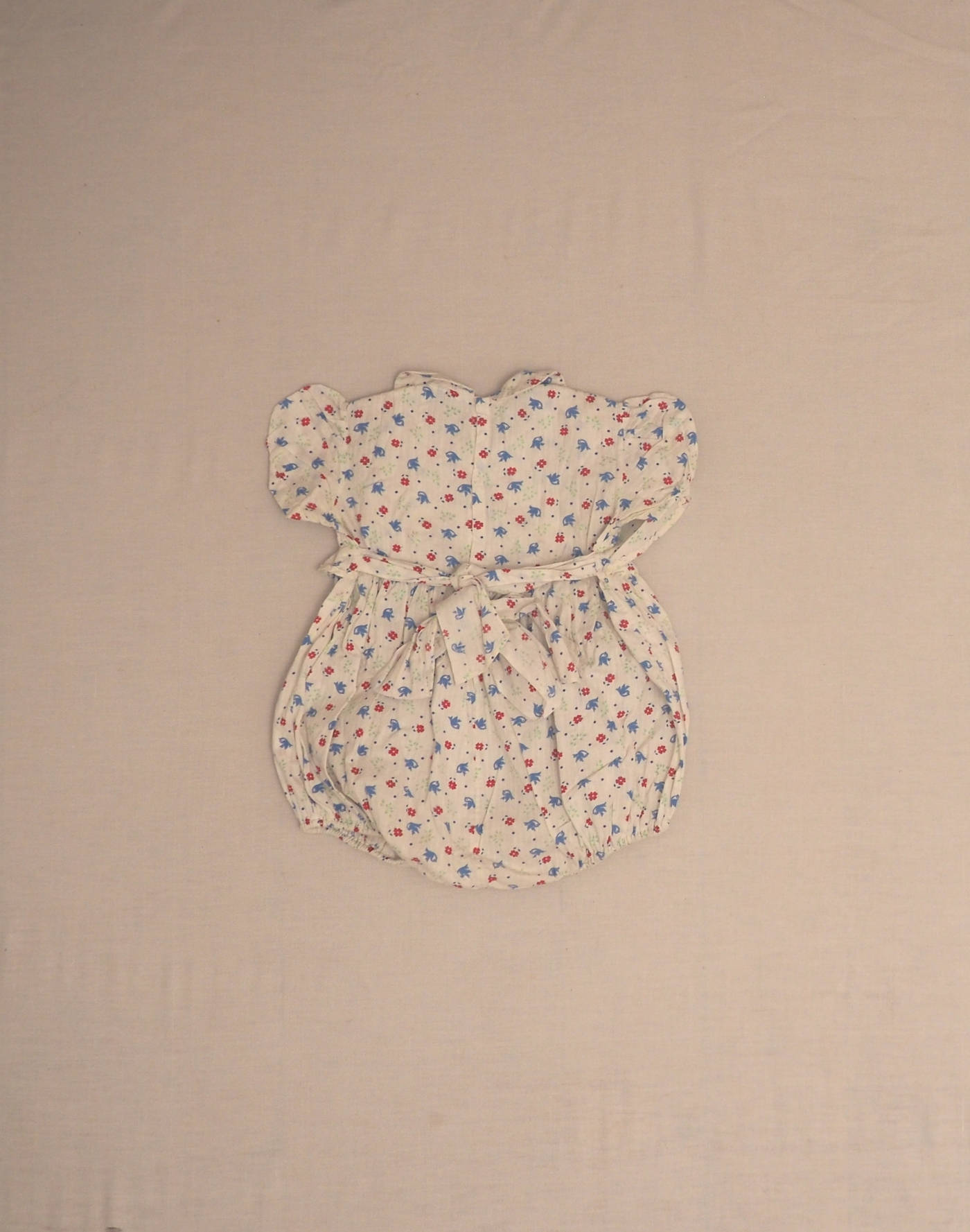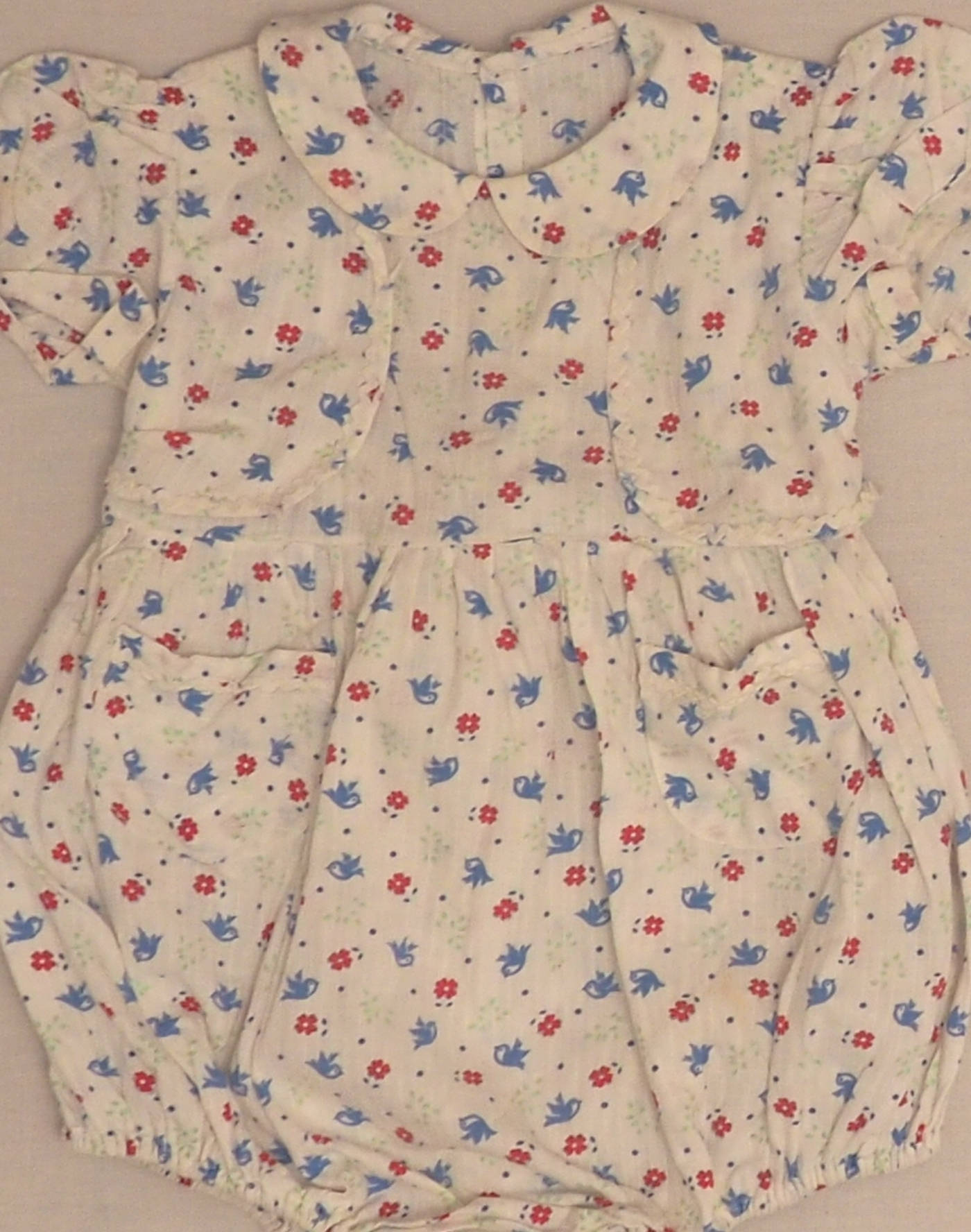 Années 1950. Très belle barboteuse blanche en coton texturé, imprimée oiseaux bleus et fleurs, manches courtes ballon, empiècement effet veston cousu sur le buste, deux poches, élastiques aux cuisses effet bloomer, une bride à nouer dans le dos. Fermée derrière par trois boutons pression, trois boutons pression à l’entrejambe. Très bon état, pas d’étiquette de composition (pièce artisanale) mais toucher coton.