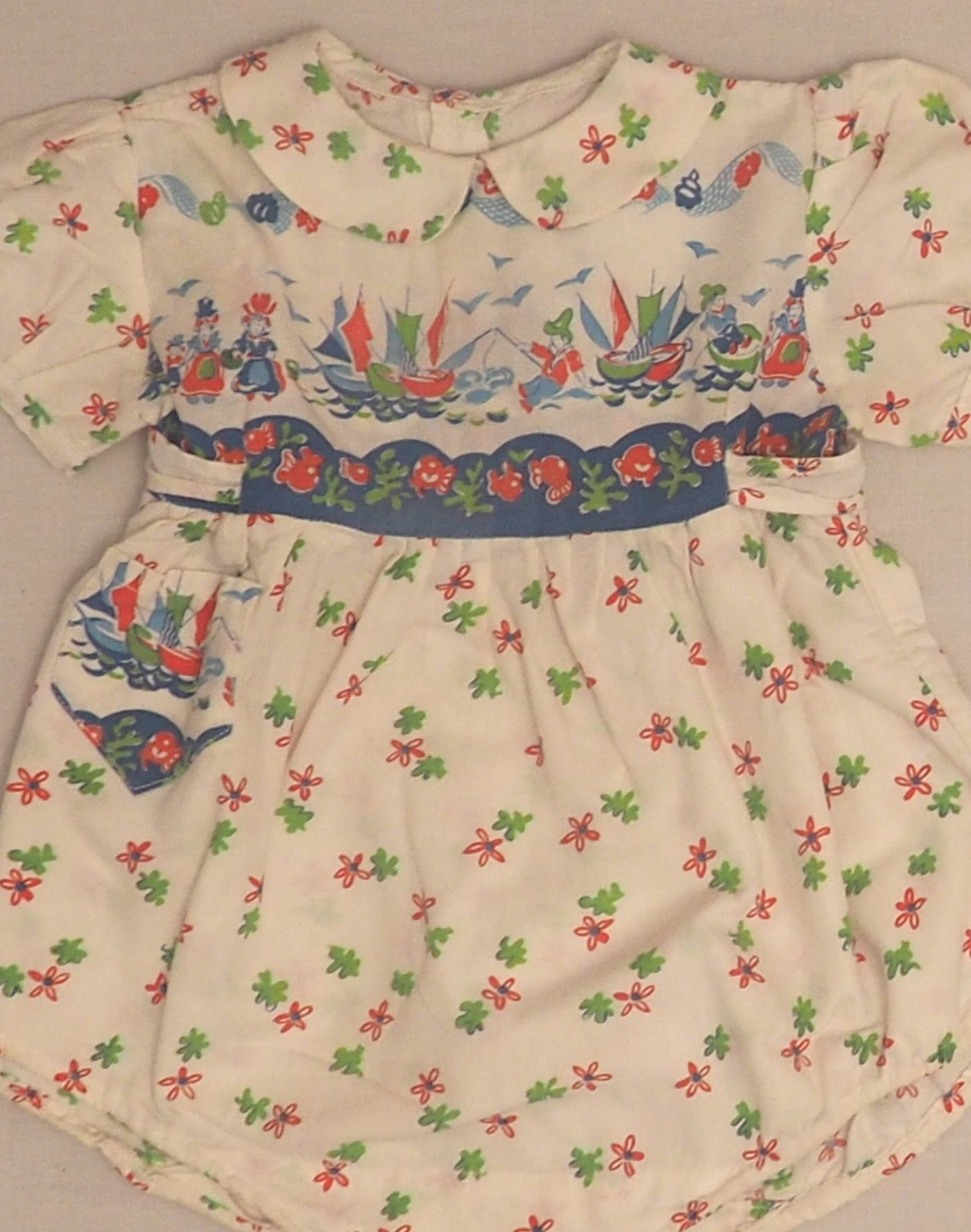 Années 1950 ou antérieur. Magnifique barboteuse en coton blanc à motif fleuri avec un buste à motif pêcheurs & poissons. Manches courtes ballon, bride à nouer dans le dos, élastiques aux cuisses. fermée dans le dos par trois boutons, deux boutons à l’entrejambe. Très bon état, pièce artisanale, toucher coton.