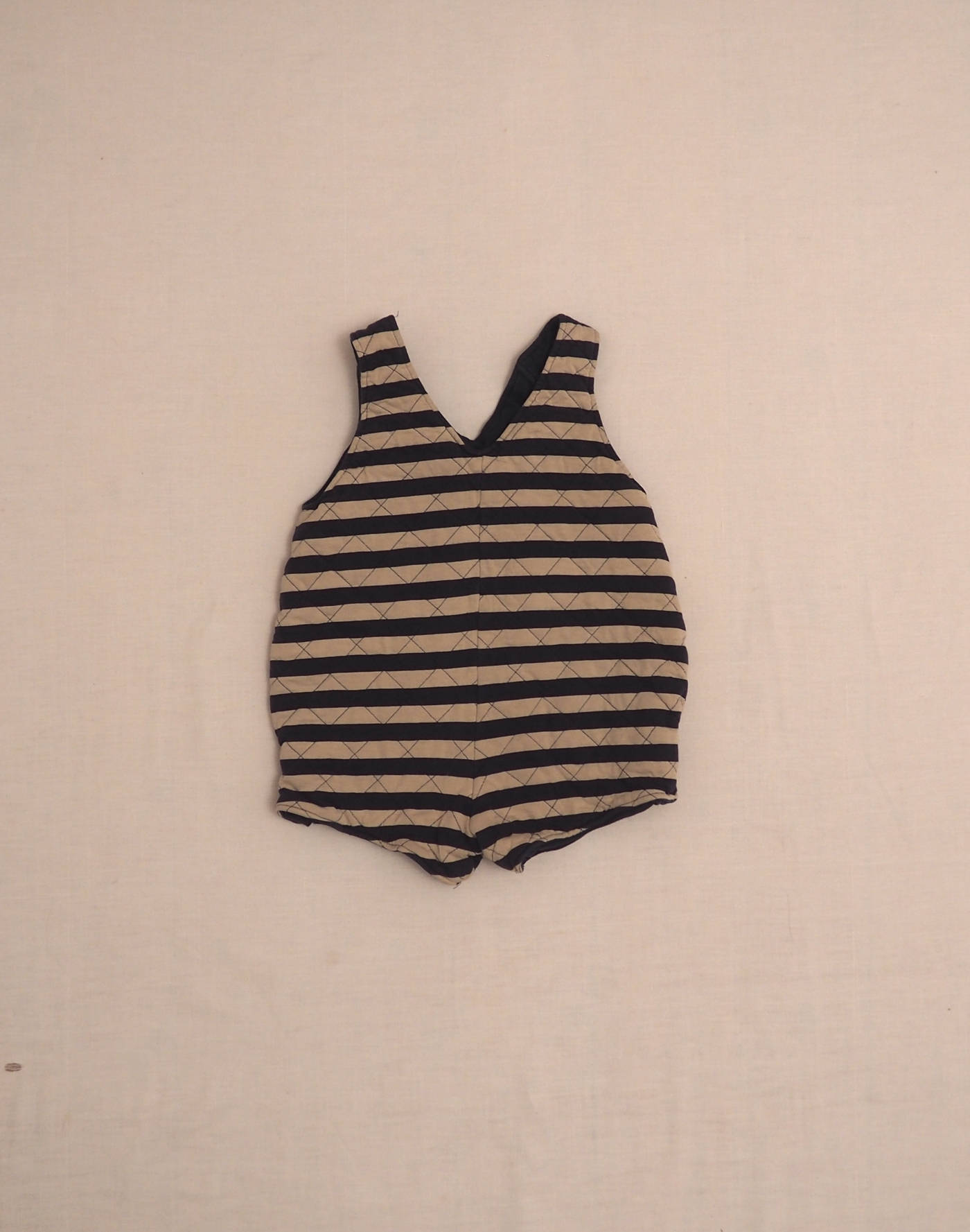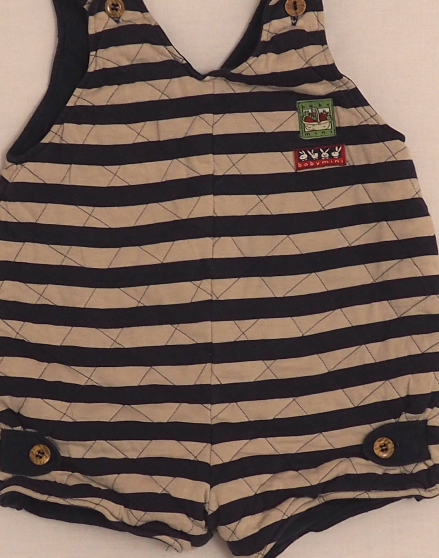 Charmante barboteuse molletonnée en jersey à rayures beige & marine, couture effet matelassage, deux petits patchs sur le buste, bretelles attachées par deux boutons, deux boutons décoratifs aux cuisses, doublée en jersey bleu marin. Très bon état, tissu 100% coton et molleton en ouate de polyester, fabriquée en Thaïlande.