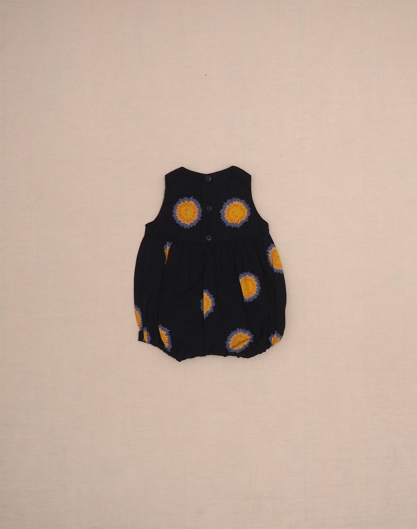 Mignonne barboteuse sans manches en coton léger marine, motif soleils, doublée sur le buste, fermée dans le dos par trois boutons, quatre boutons pression à l’entrejambe. Très bon état, 100% coton.