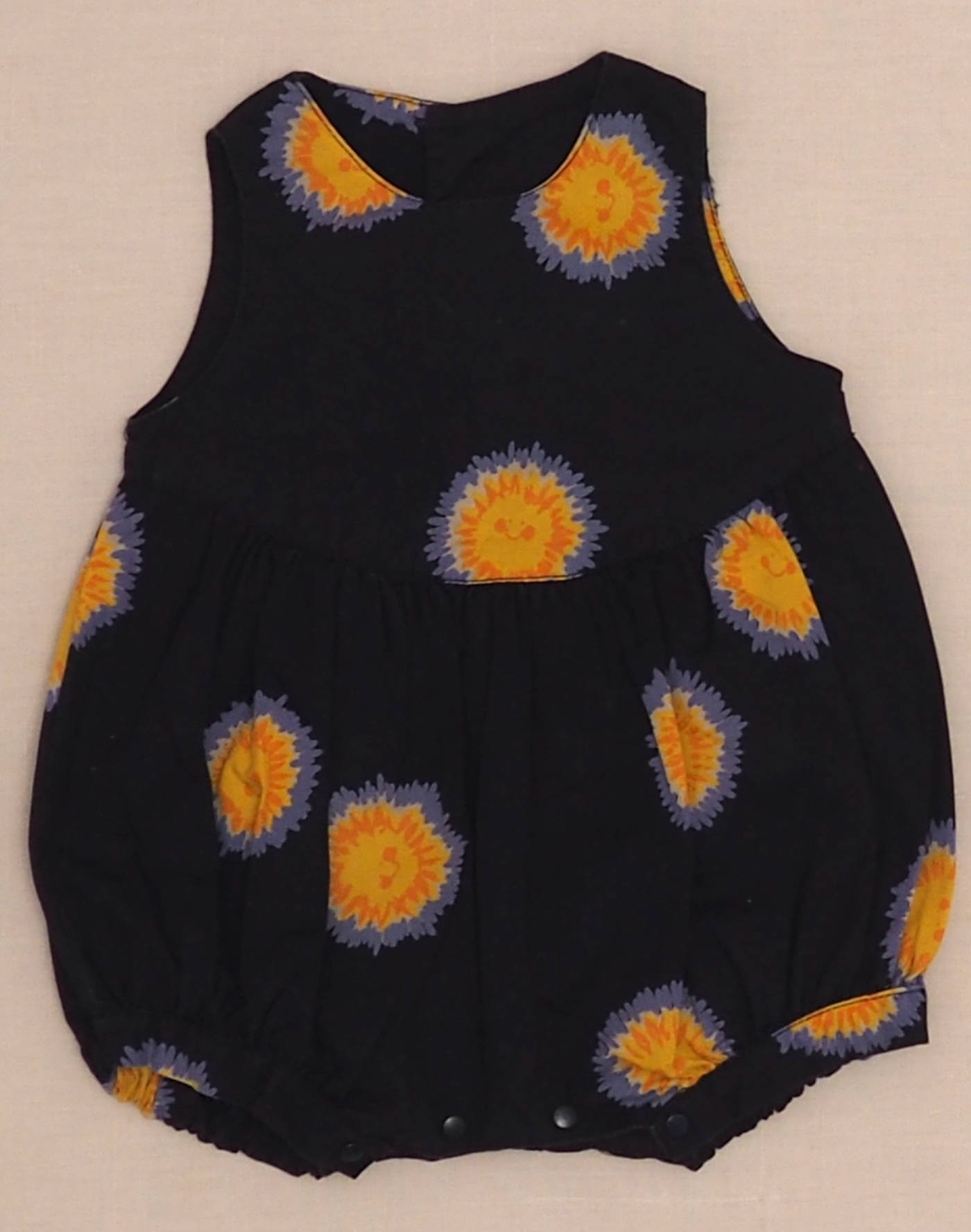 Mignonne barboteuse sans manches en coton léger marine, motif soleils, doublée sur le buste, fermée dans le dos par trois boutons, quatre boutons pression à l’entrejambe. Très bon état, 100% coton.