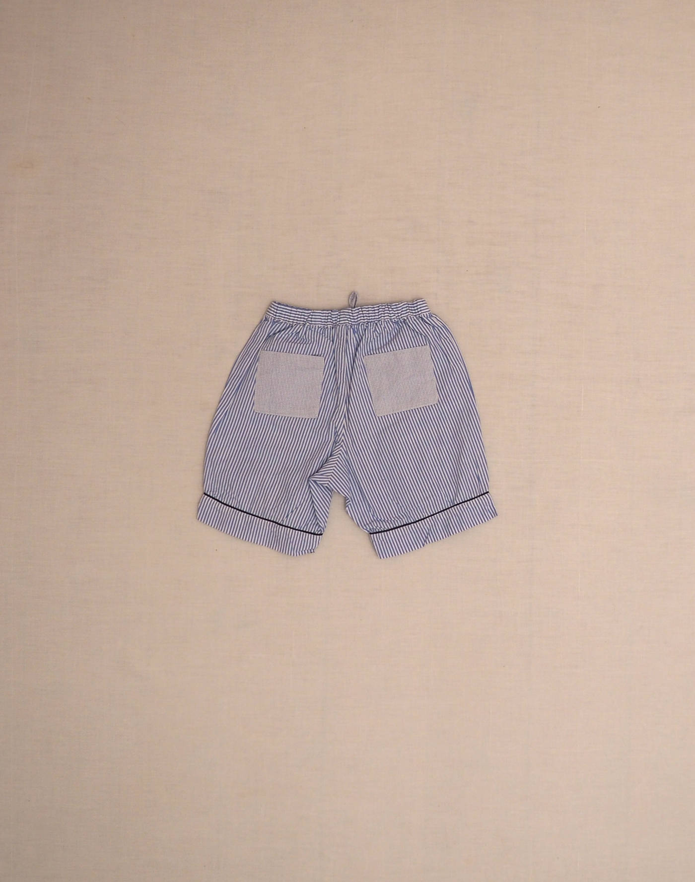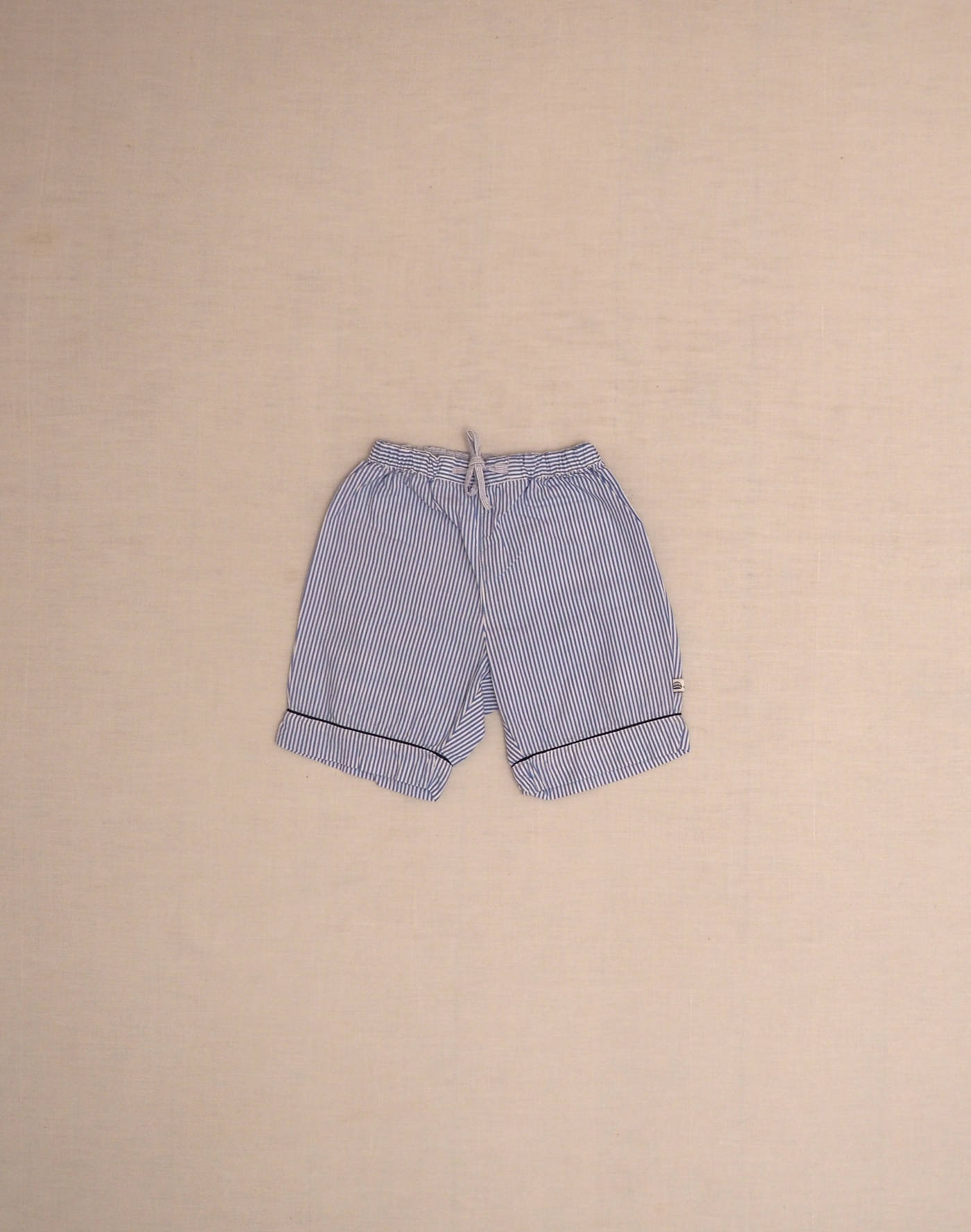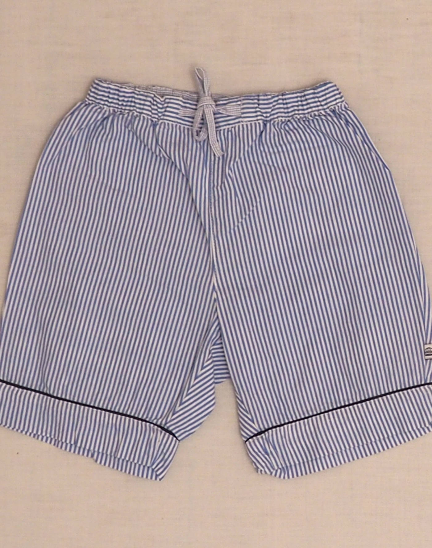 Jacadi vintage. Bermuda à fines rayures bleues, passepoil marine sur le bas de jambe, taille élastique avec cordon à nouer. Très bon état, 100% coton.