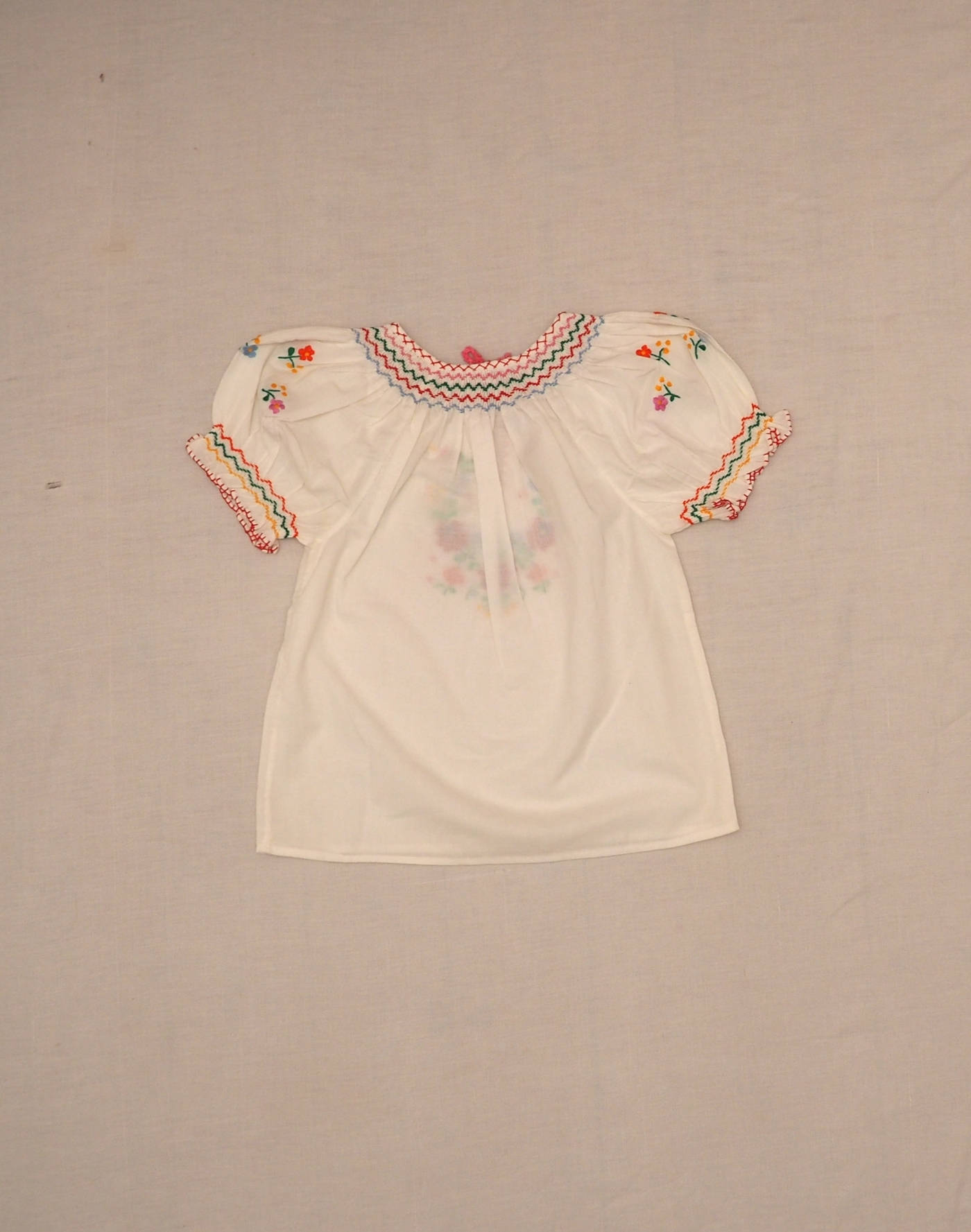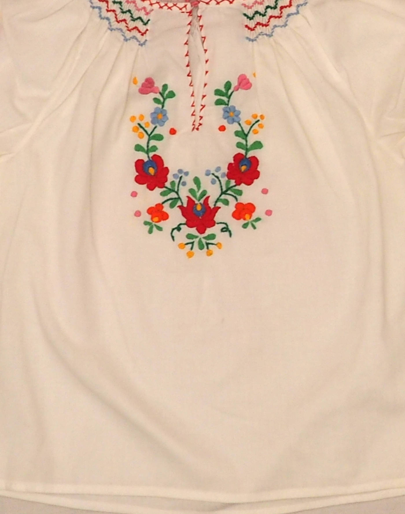 Taille 5-6ans. Ravissante blouse en coton à manches courtes ballon smockées, smock sur le col avec petit cordon à nouer, broderie florale sur le buste et les épaules. Coutures anglaises. Très bon état, pas d’étiquette de composition mais toucher coton.