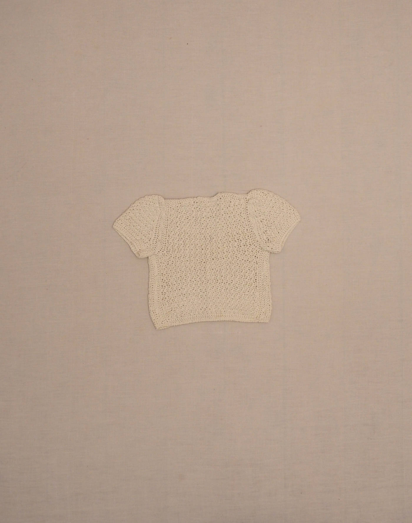 Années 1950, pièce crochetée à la main. Charmante petite blouse en beau point de crochet blanc, manches courtes ballon, fermée par trois boutons devant. Très bon état, toucher coton.