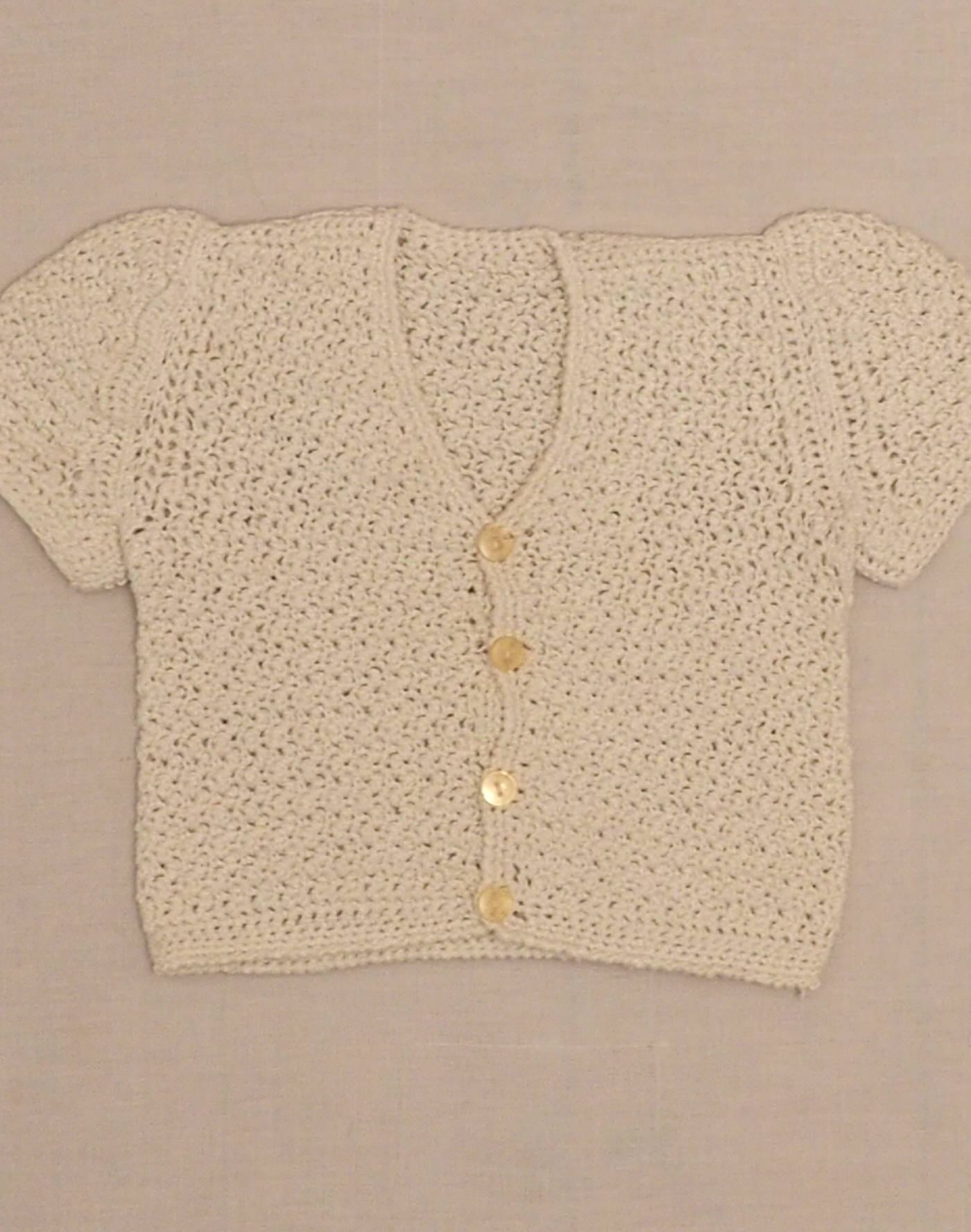 Années 1950, pièce crochetée à la main. Charmante petite blouse en beau point de crochet blanc, manches courtes ballon, fermée par trois boutons devant. Très bon état, toucher coton.