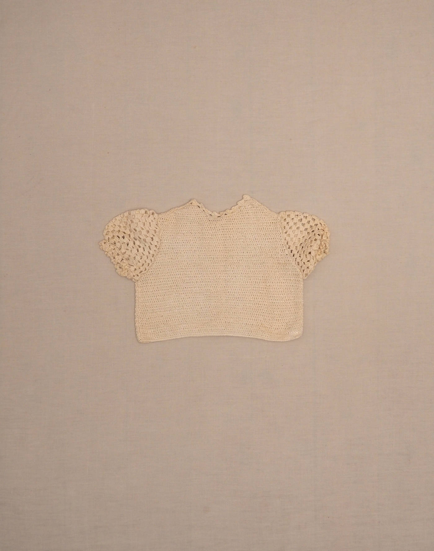Pièce crochetée à la main, années 1960. Somptueuse blouse courte (effet bolero en crochet avec manches ballon ajourées, joli détail de crochet sur le col, fermée par cinq boutons en forme de fleurs avec strass.