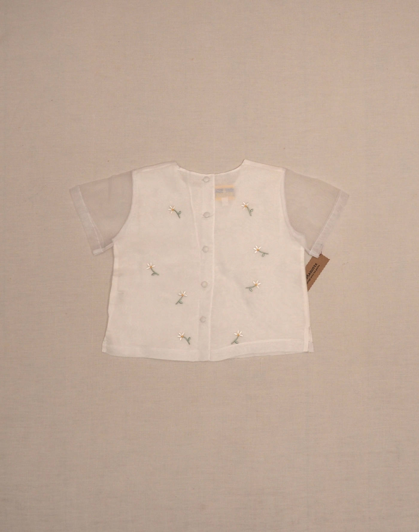 Charmante blouse en gaze à manches courtes, doublée sur le buste et le dos, brodée de petites pâquerettes. Fermée dans le dos par cinq boutons recouverts de tissu. Très bon état, gaze 100% polyester, doublure 100% coton.