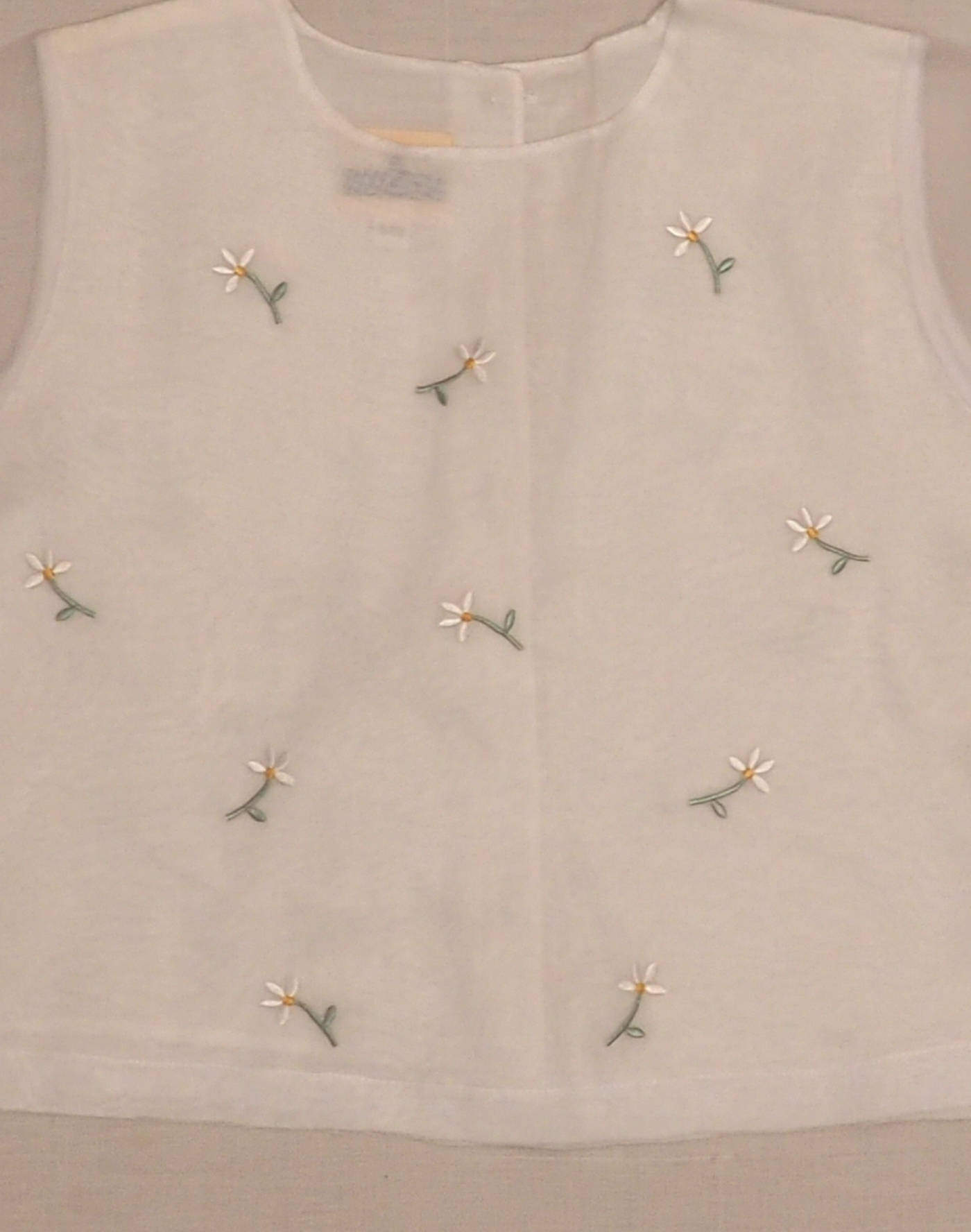 Charmante blouse en gaze à manches courtes, doublée sur le buste et le dos, brodée de petites pâquerettes. Fermée dans le dos par cinq boutons recouverts de tissu. Très bon état, gaze 100% polyester, doublure 100% coton.