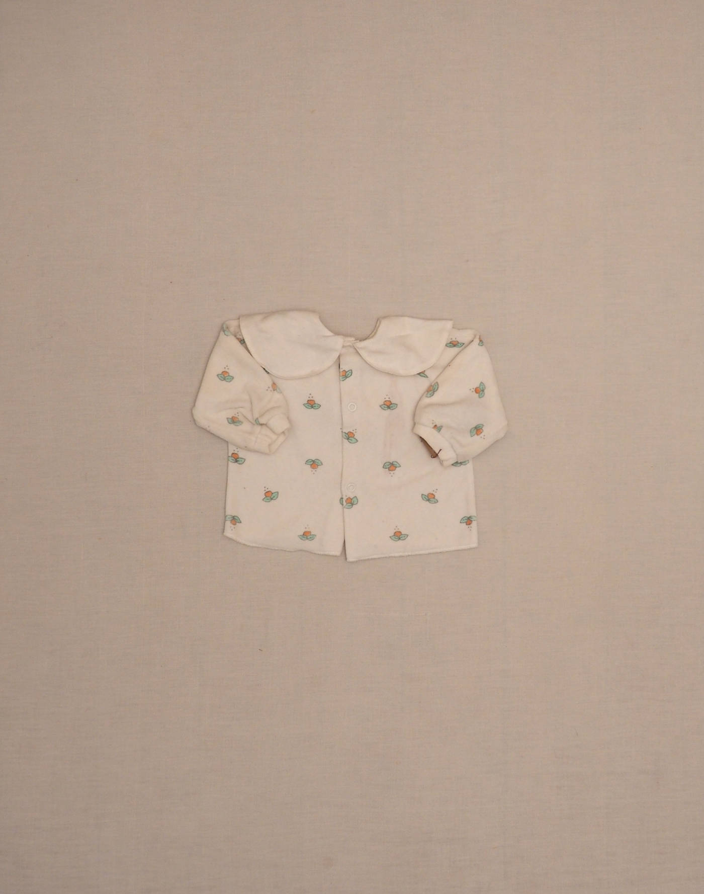 Ravissante blouse en velours blanc à petites fleurs, grand col en coton imprimé insectes superhéros (?), fermée dans le dos par trois boutons pression. Très bon état, tissu 80% coton, 20% polyester, fabriqué au Portugal.