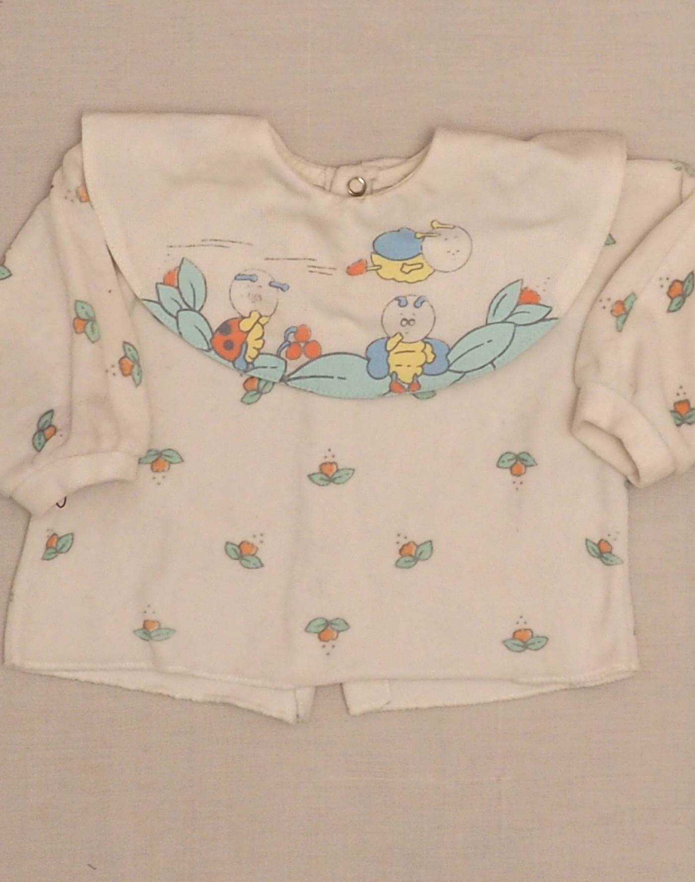 Ravissante blouse en velours blanc à petites fleurs, grand col en coton imprimé insectes superhéros (?), fermée dans le dos par trois boutons pression. Très bon état, tissu 80% coton, 20% polyester, fabriqué au Portugal.