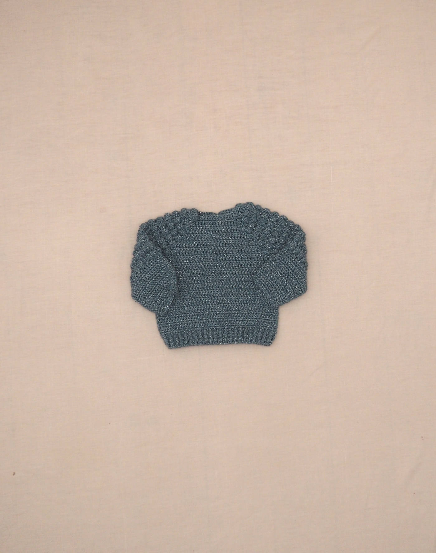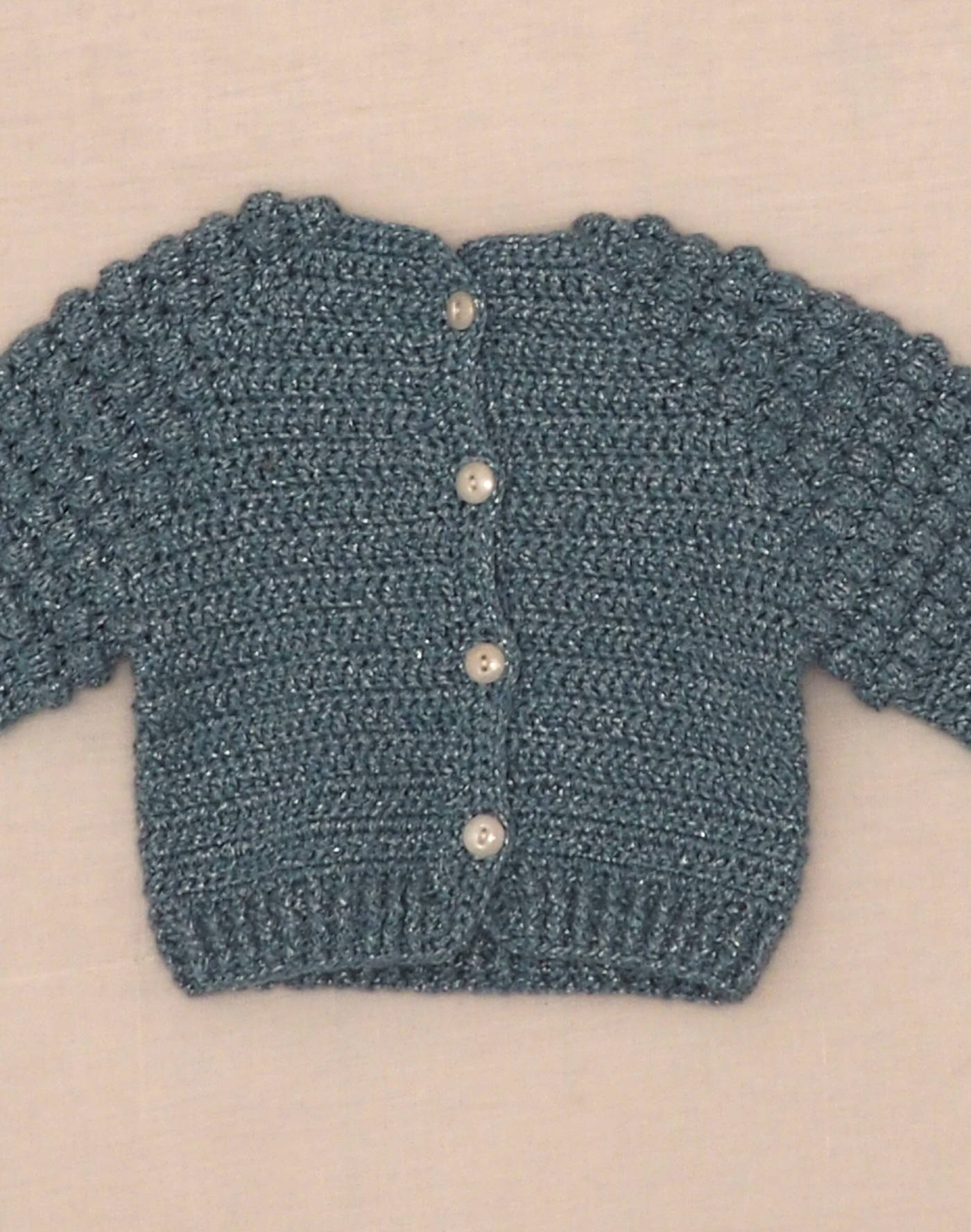 Pièce tricotée à la main. Magnifique cardigan avec point popcorn sur les manches, maille mélangée bleue avec lurex, fermé par quatre boutons nacrés. Très bon état, toucher laine mélangée douce.