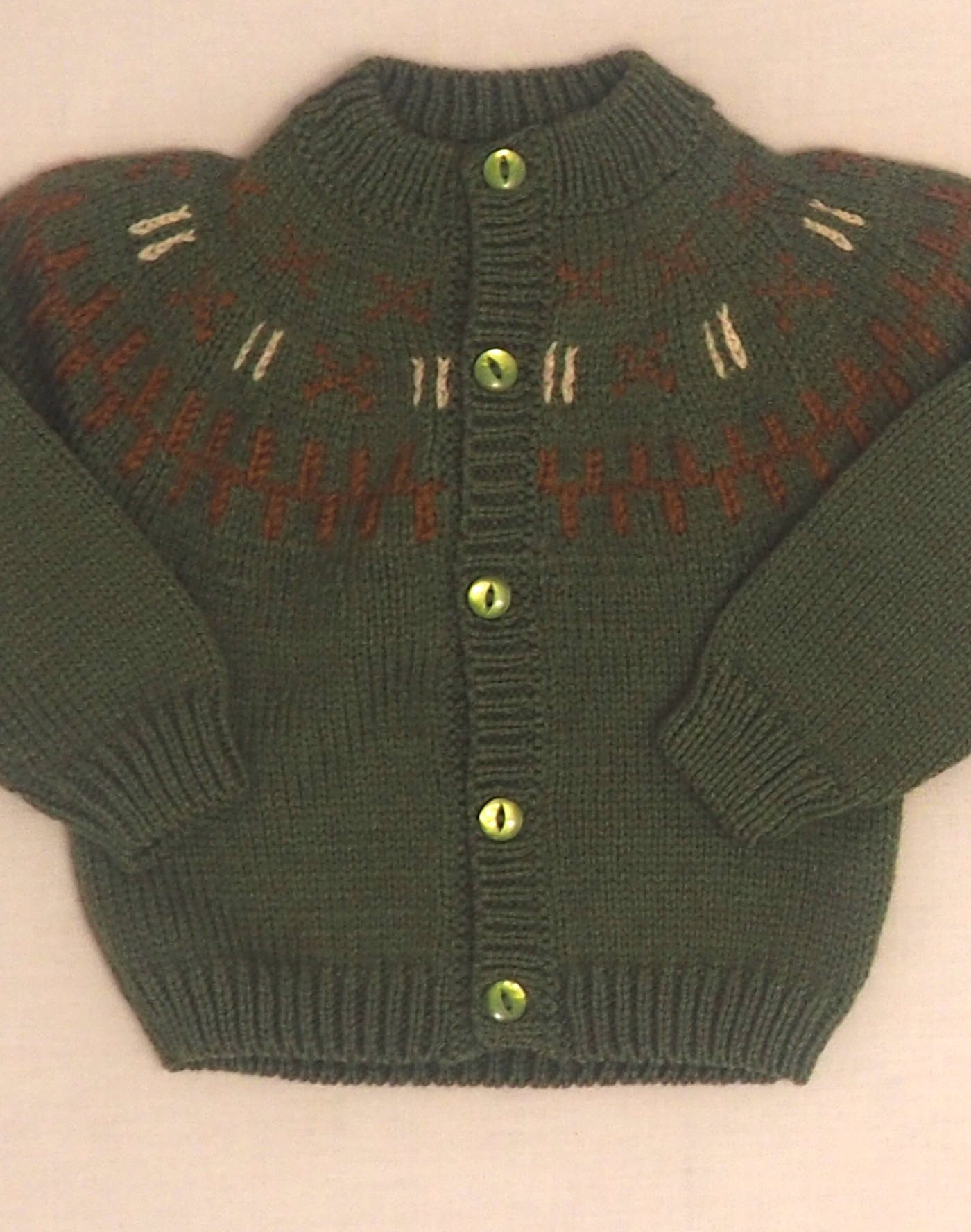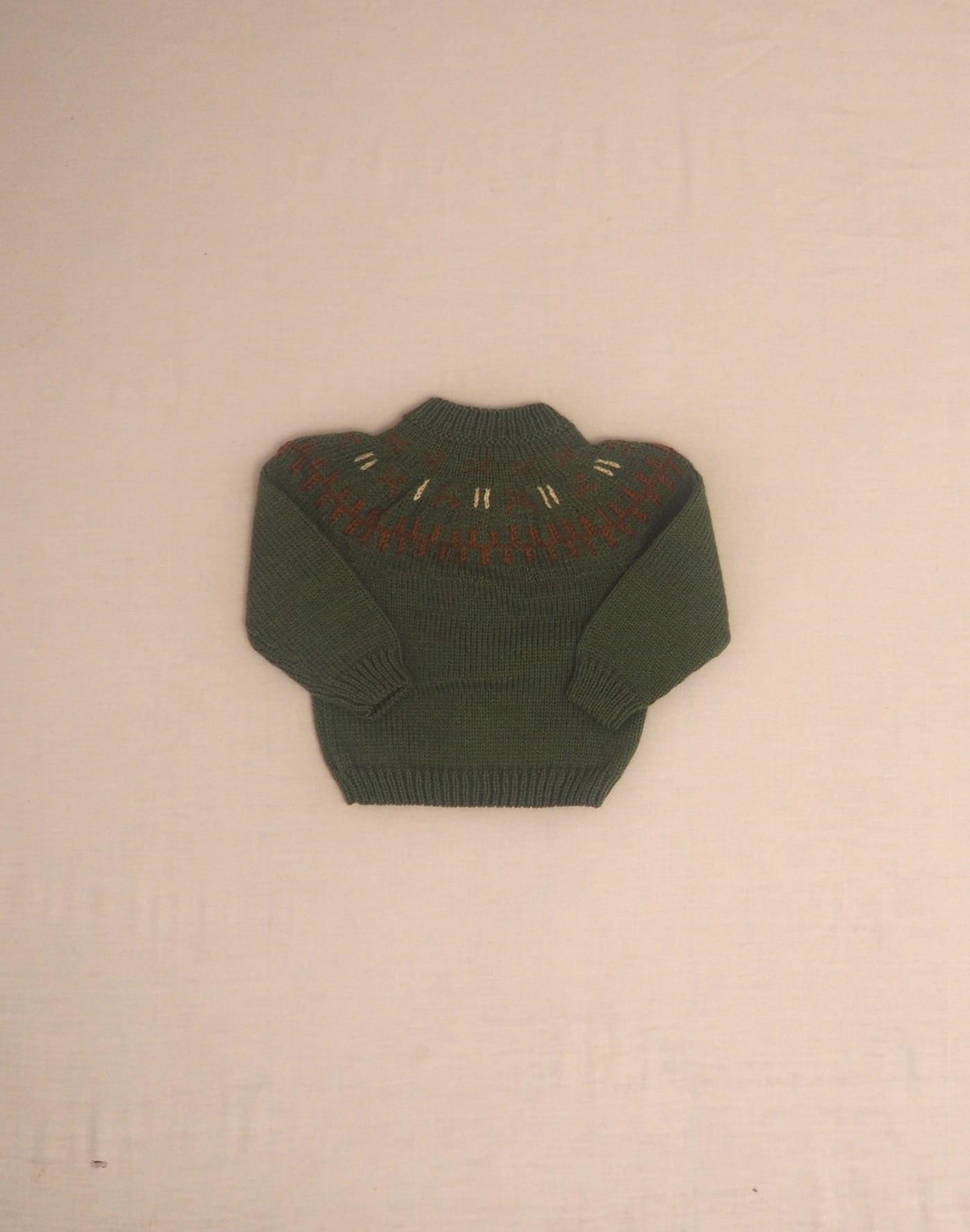 Pièce tricotée à la main. Très beau cardigan vert avec motif jacquard marron et blanc sur les épaules, fermé par cinq boutons. Très bon état, toucher laine douce.