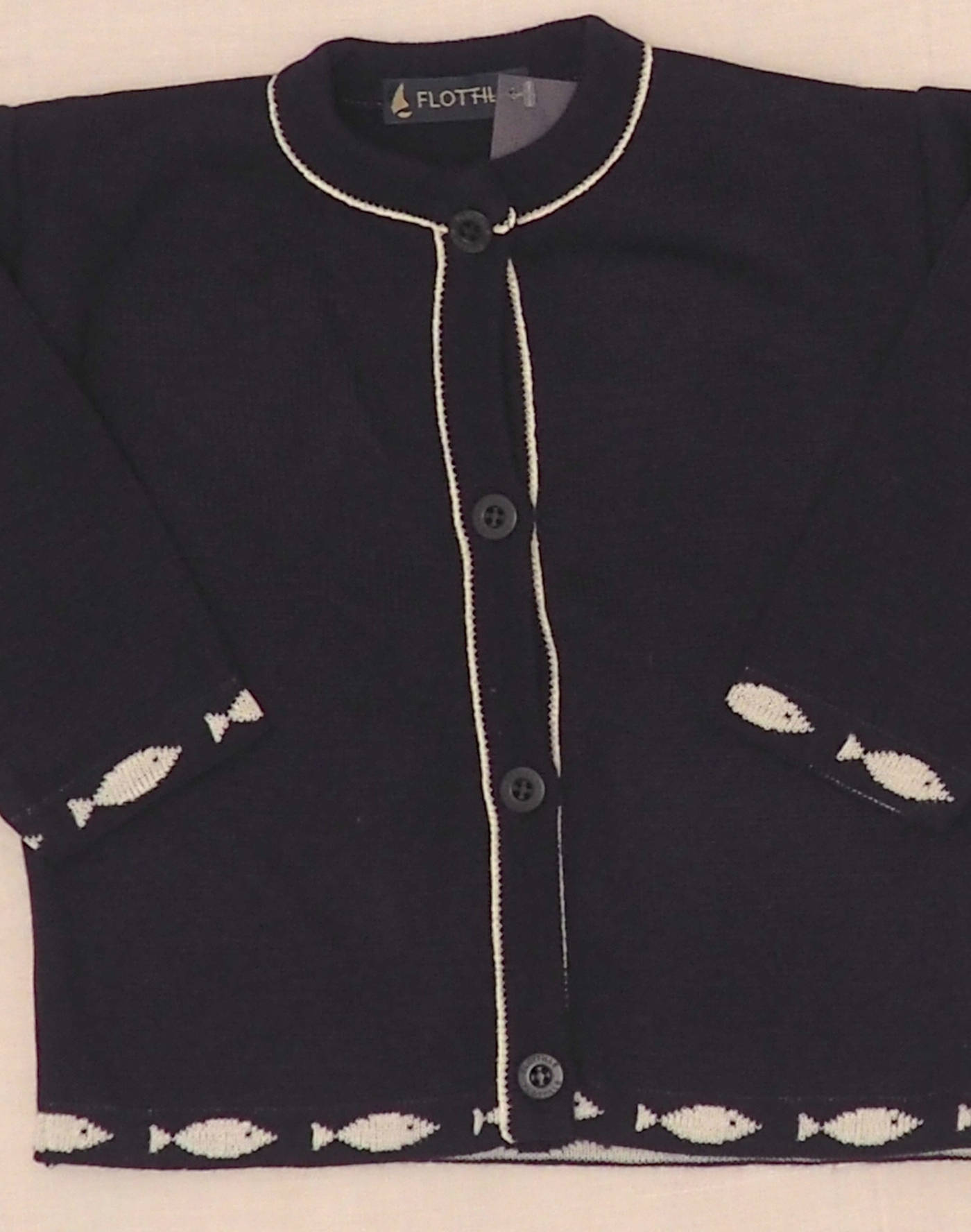 Joli cardigan bleu marine avec frise de poissons sur la taille et les poignets. Fermé par quatre boutons. Fabriqué en France, état neuf, maille 99% acrylique, 1% laine.