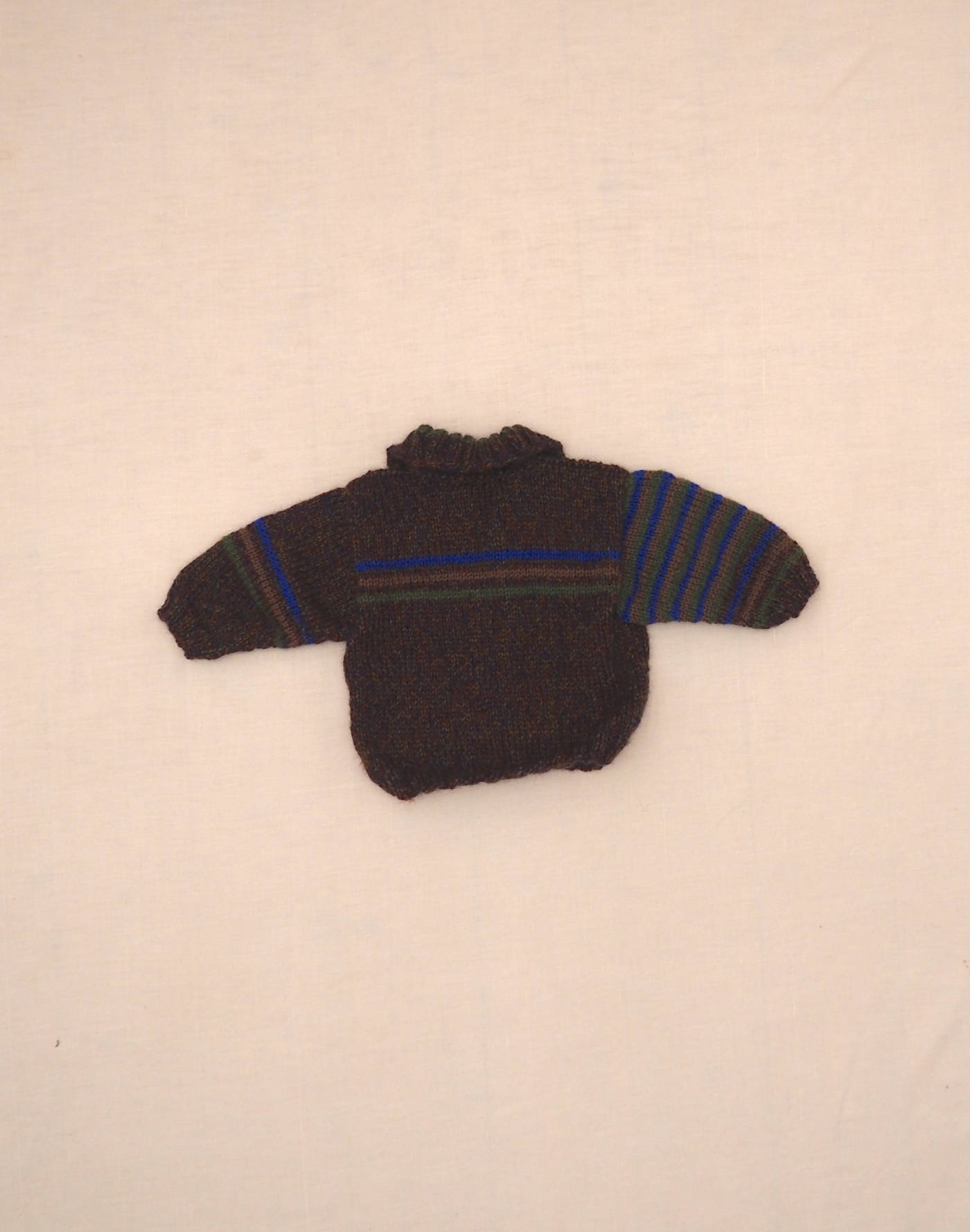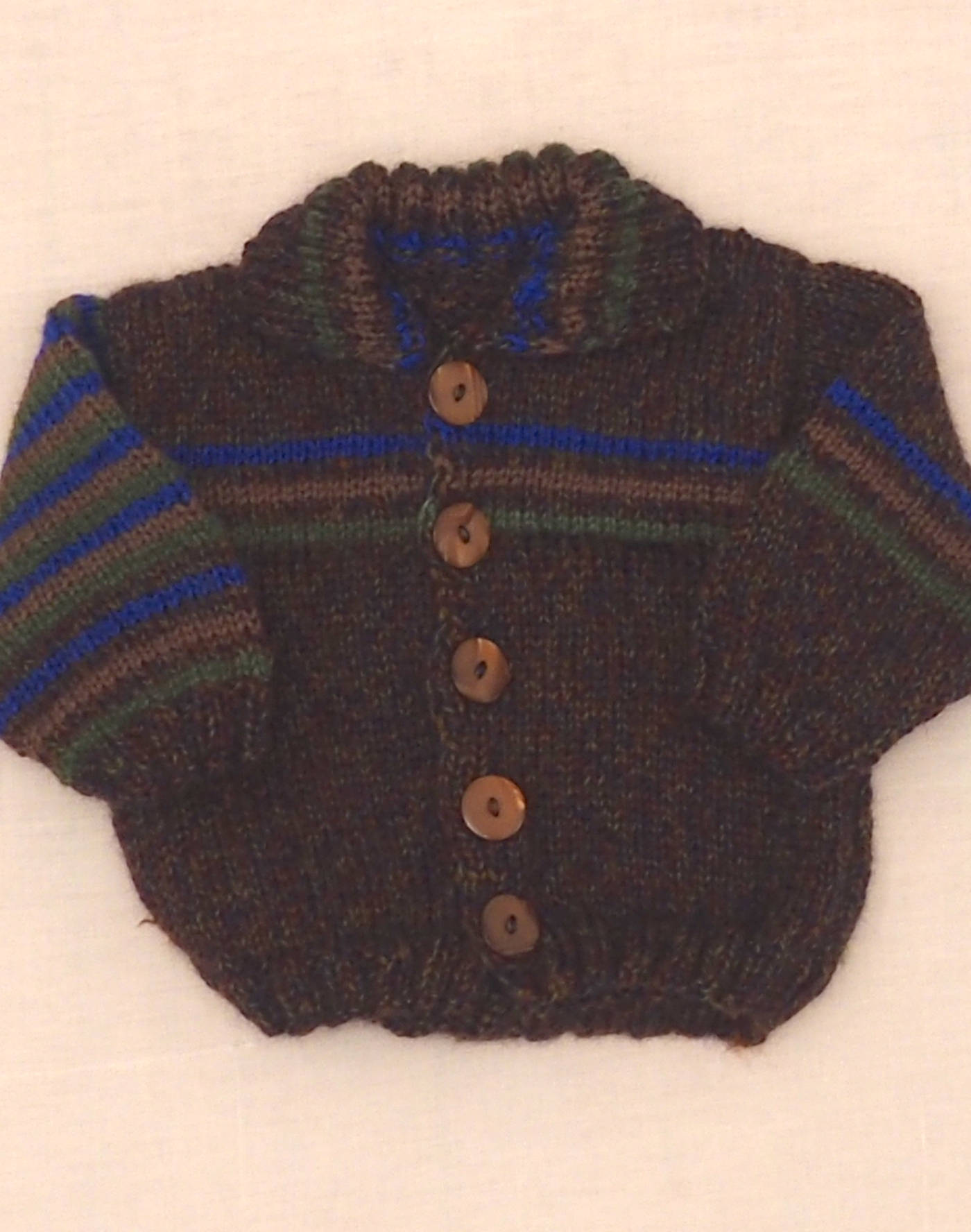 Pièce tricotée main. Mignon cardigan en laine épaisse chinée avec rayures sur les manches et le buste, petit col. Fermé par cinq boutons. Très bon état, toucher laine.