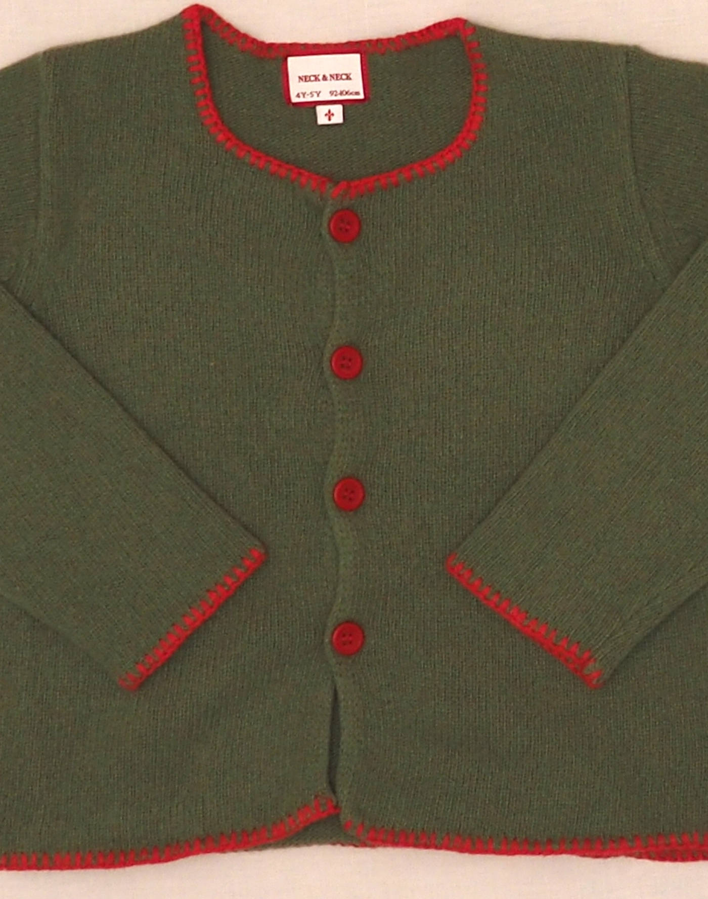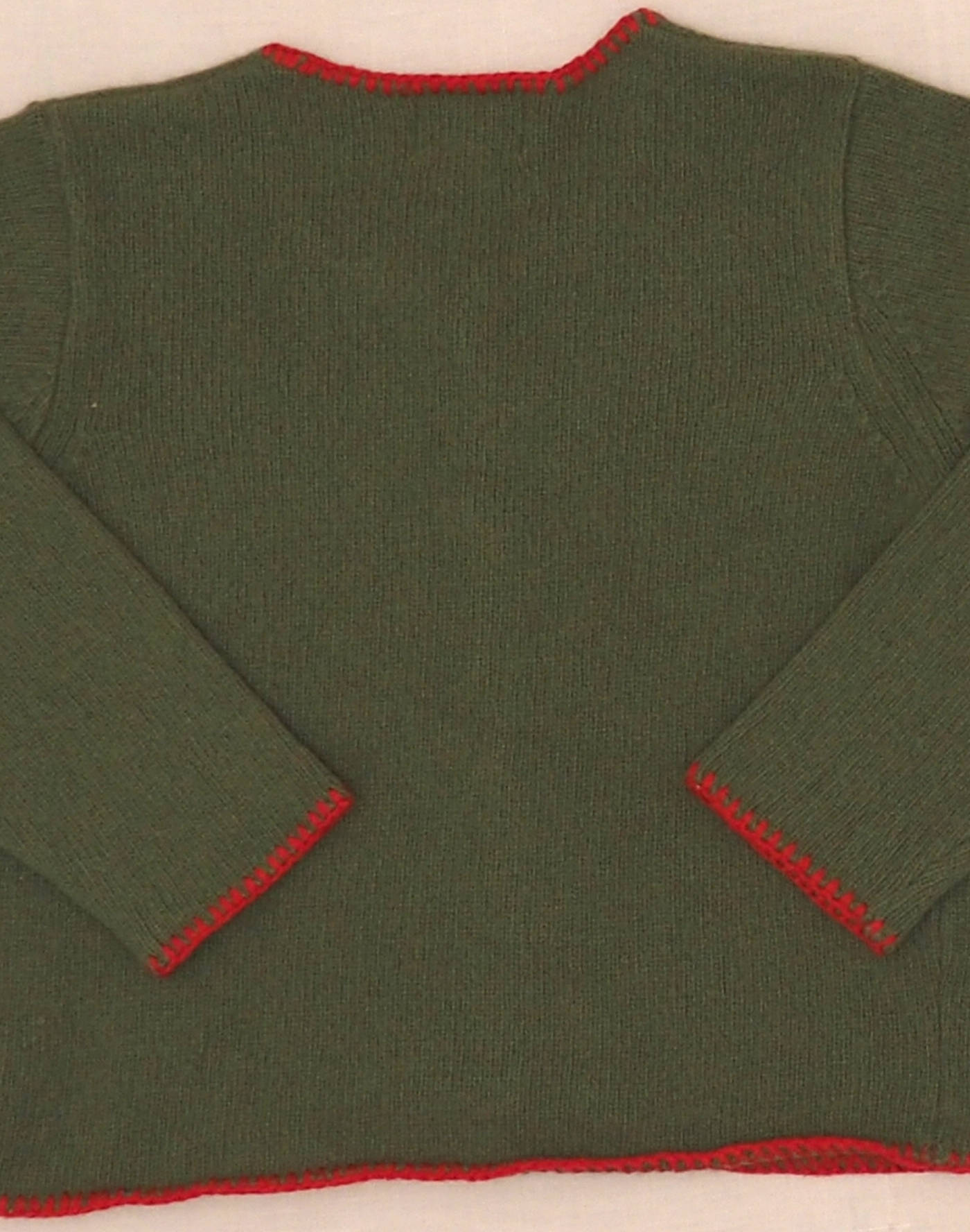 Mignon cardigan en maille verte douce, rebrodé de rouge sur les bords, fermé par quatre boutons rouge. Très bon état, pas d’étiquette de composition.