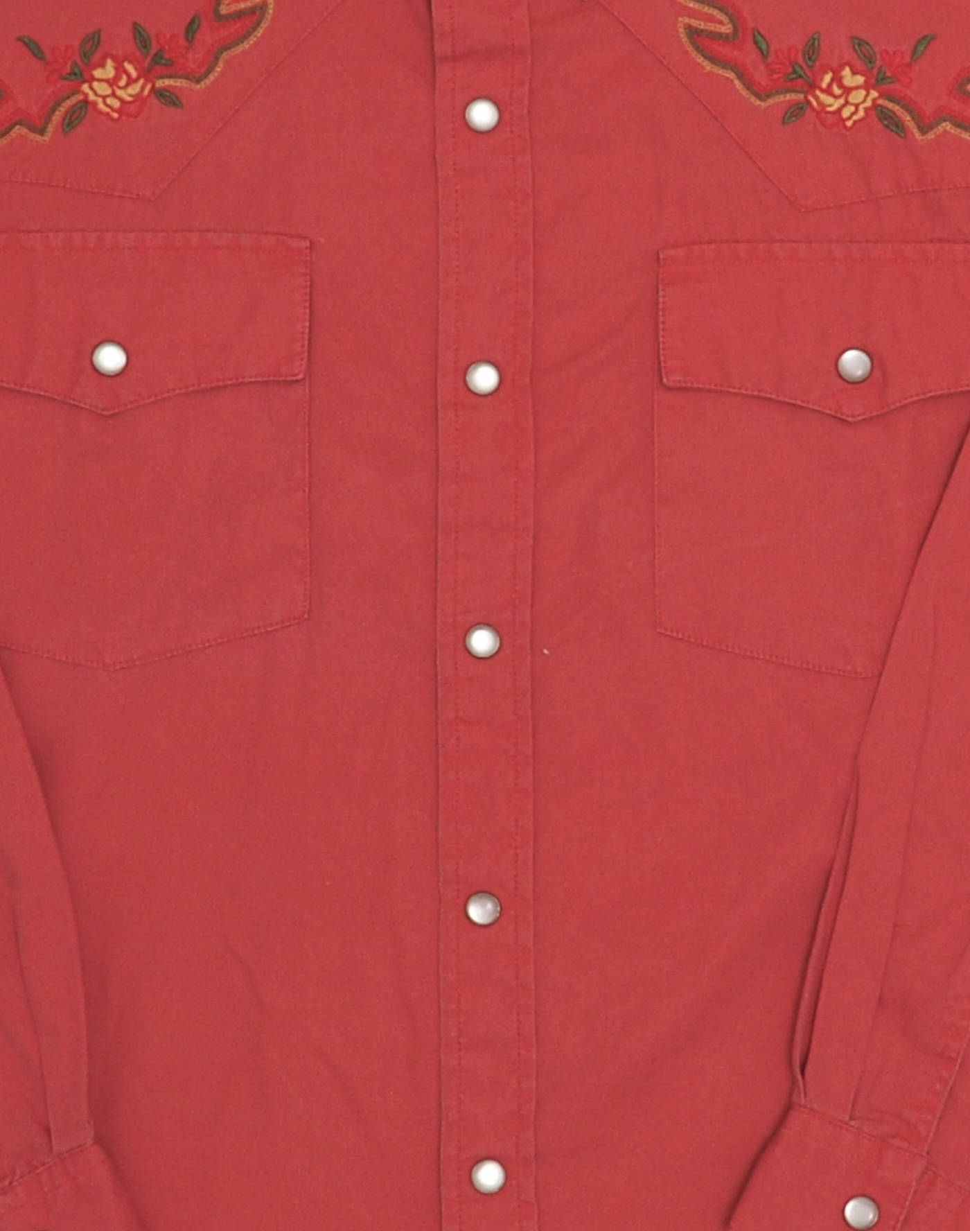 Taille 14 ans. Très élégante chemise rouge-rose effet cowboy avec broderies sur le buste. Deux poches boutonnées sur la poitrine, manches longues boutonnées, fermée par six boutons pression nacrés. Très bon état, 100% coton.