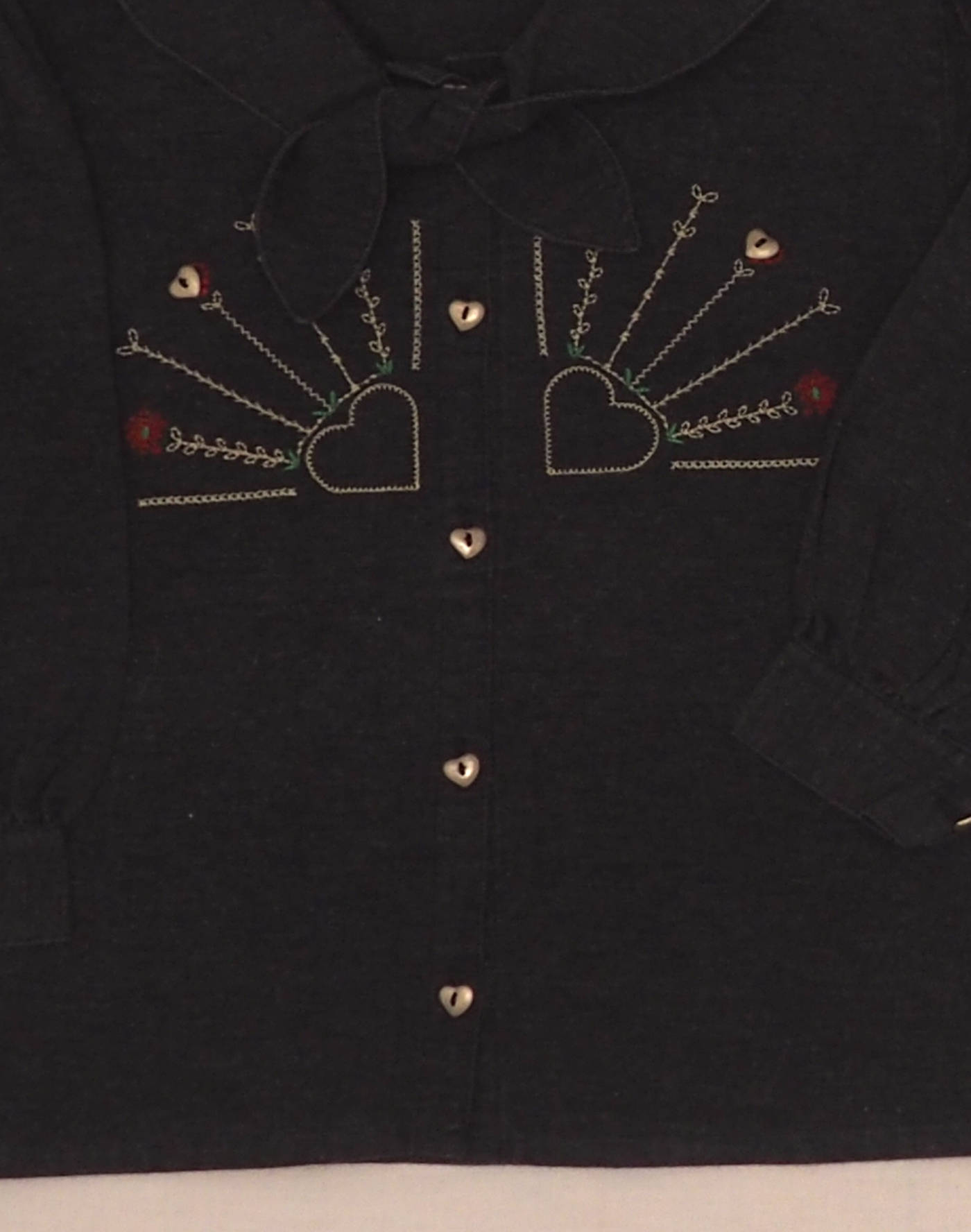 Ravissante chemise gris chiné à manches longues boutonnées légèrement bouffantes, col foulard à nouer, motif floral brodé sur le buste. Fermée par cinq boutons en forme de coeur. Très bon état, tissu 75% coton, 25% polyester.