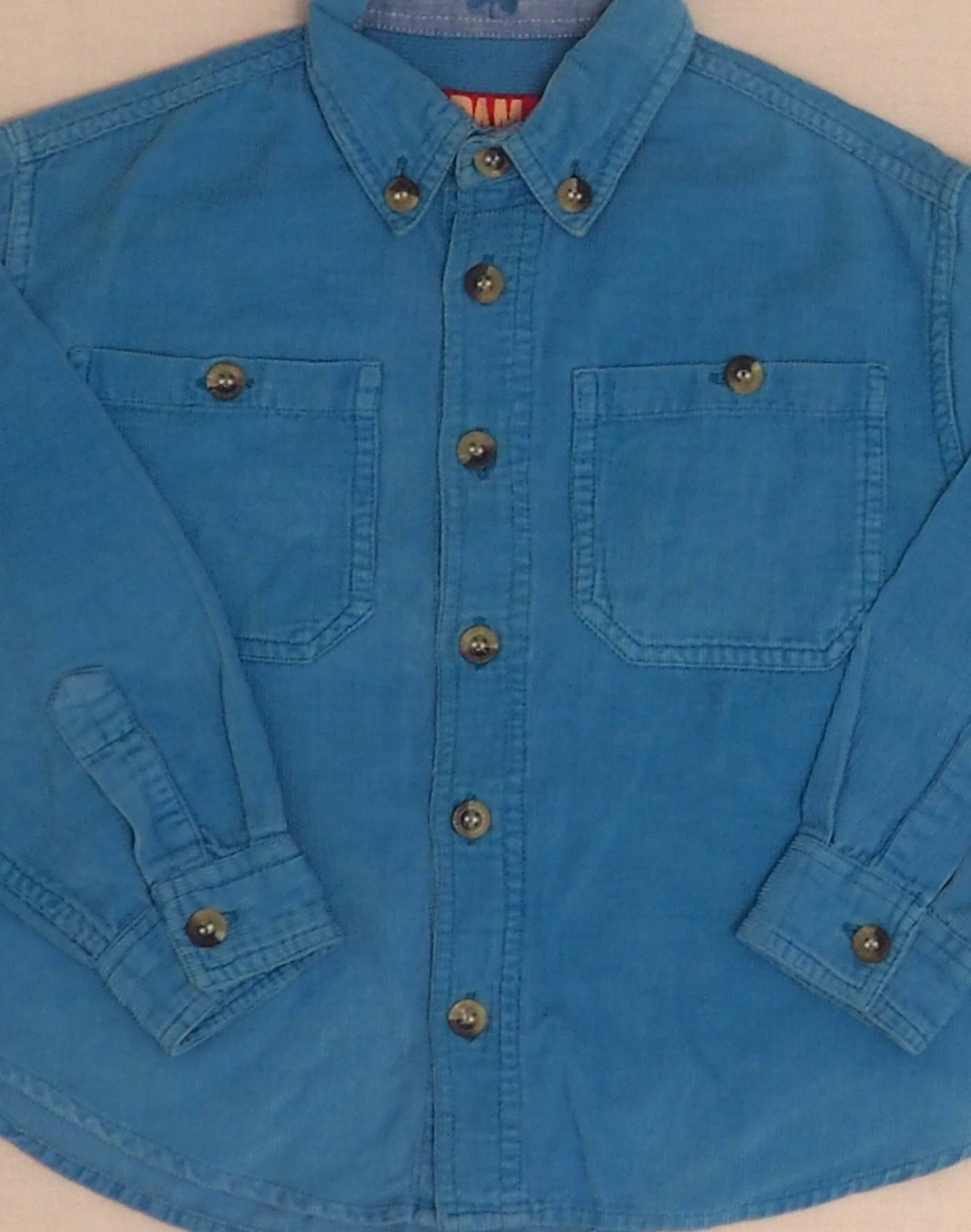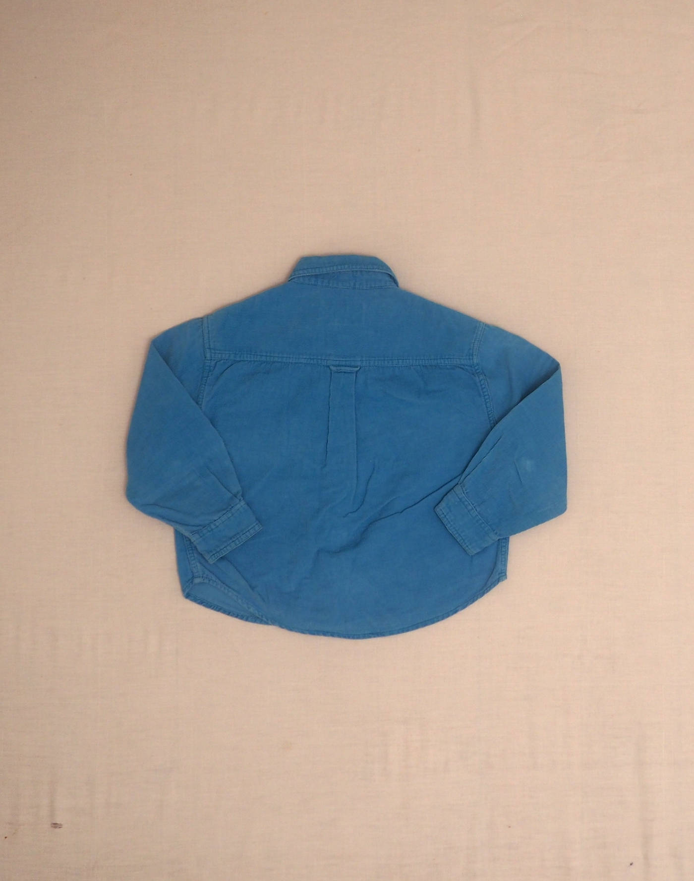 Intemporelle chemise en velours finement côtelé bleu, manches longues boutonnées, col boutonné, deux poches boutonnées sur la poitrine, fermée par six boutons effet corne. Petite broderie trèfle sur l’envers du col. Très bon état, 100% coton. Indiquée 4 ans mais correspond plutôt à un 3 ans.