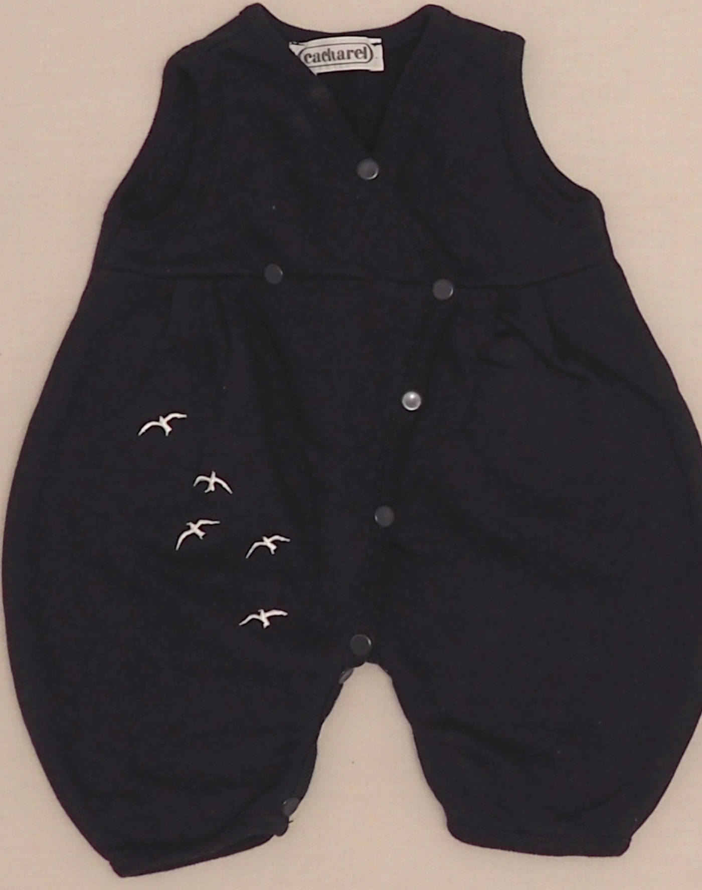 Cacharel vintage. Mignonne combinaison sans manches marine brodée d’oiseaux sur une jambe, fermeture en diagonale avec six boutons pression, six boutons pression à l’entrejambe. Très bon état, 100% coton.