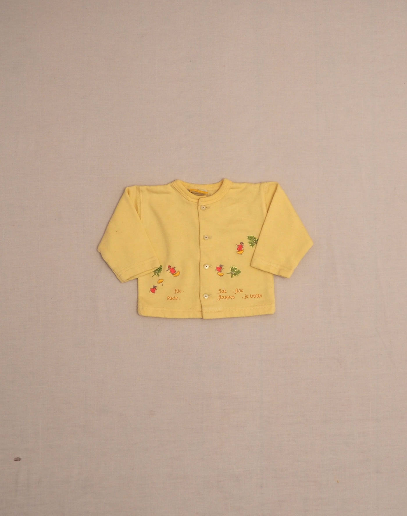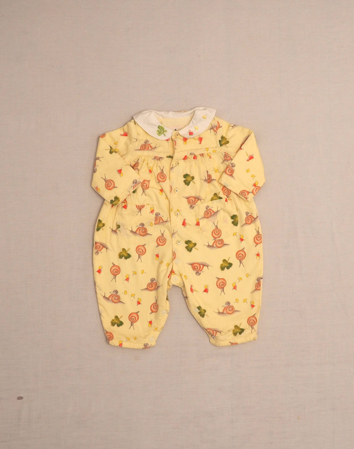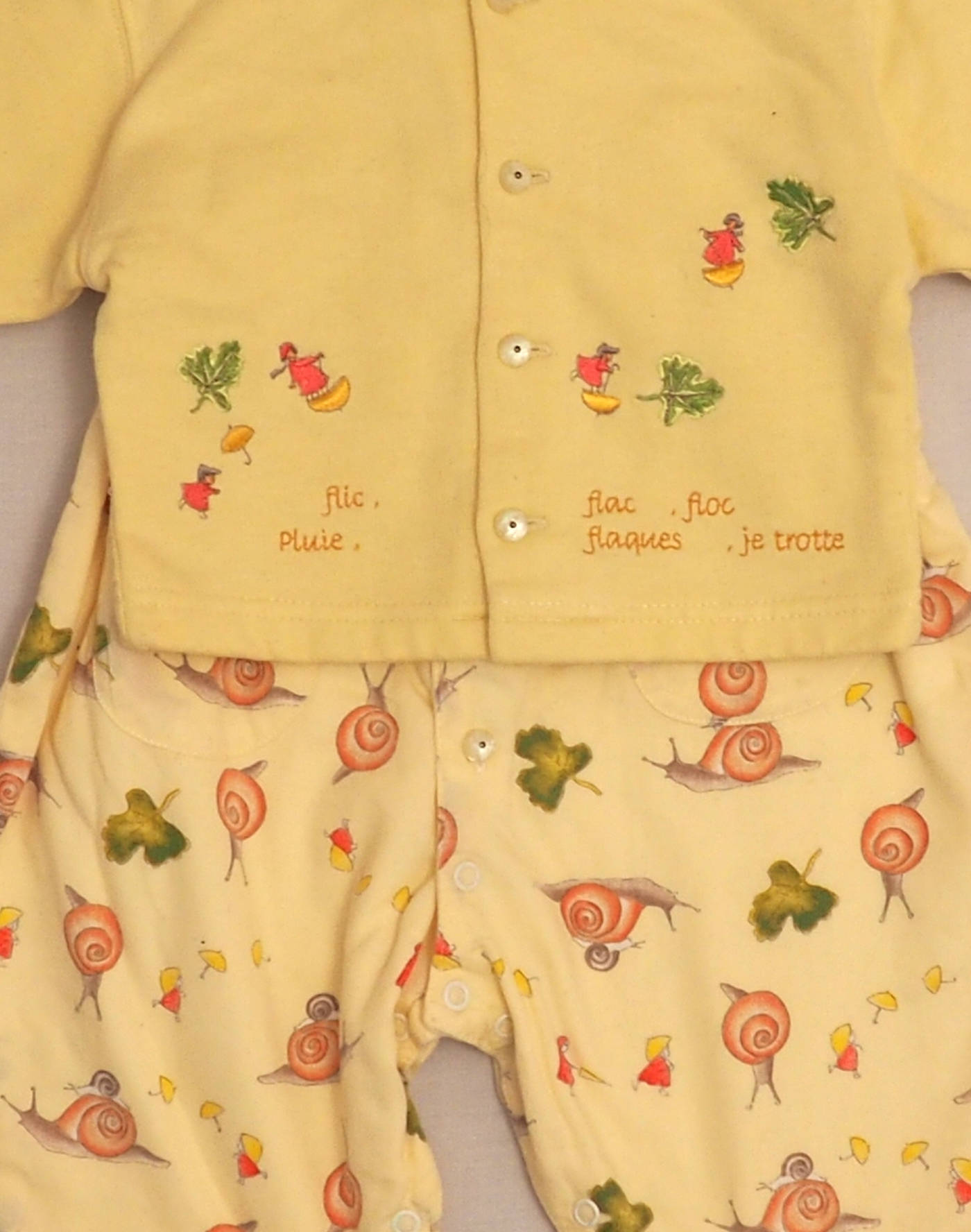 Magnifique ensemble composé d’une combinaison jaune pâle à motif escargots & petits personnages, col blanc brodé, deux poches plaquées devant, doublée en jersey, fermée par six boutons devant, six boutons à l’entrejambe, et d’un cardigan en jersey jaune brodé de petits personnages, fermé par quatre boutons devant. Très bon état, combinaison 100% coton, cardigan 50% coton, 50% acrylique.