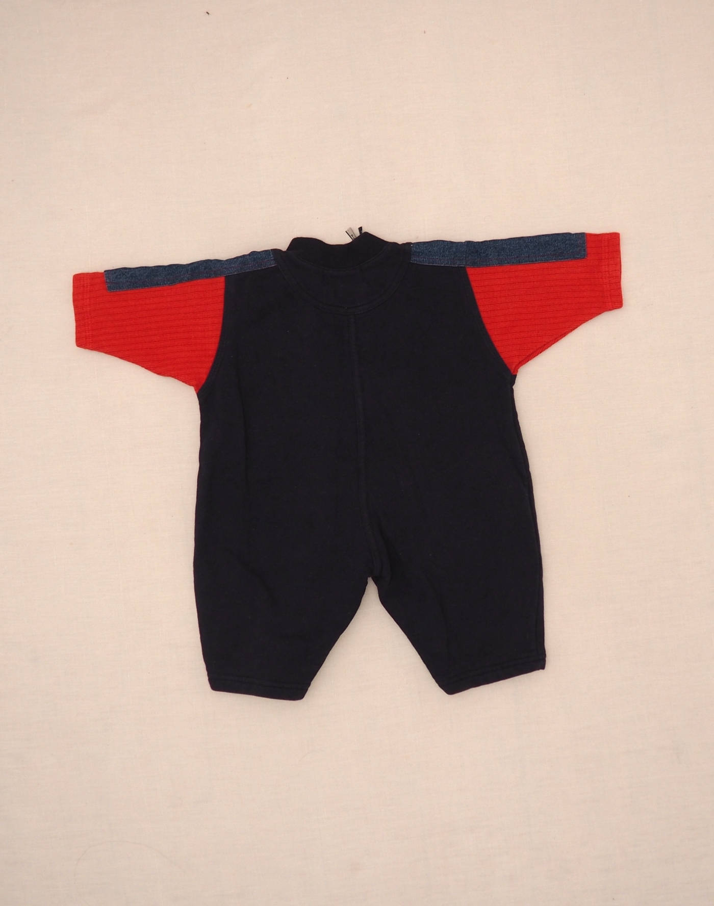 Mignonne combinaison multi-matières avec corps en jersey bleu marine, deux pcohes plaquées devant, empiècement en jean et jersey côtelé rouge sur les manches, fermeture éclair devant et huit boutons pression à l’entrejambe. Très bon état, 100% coton.