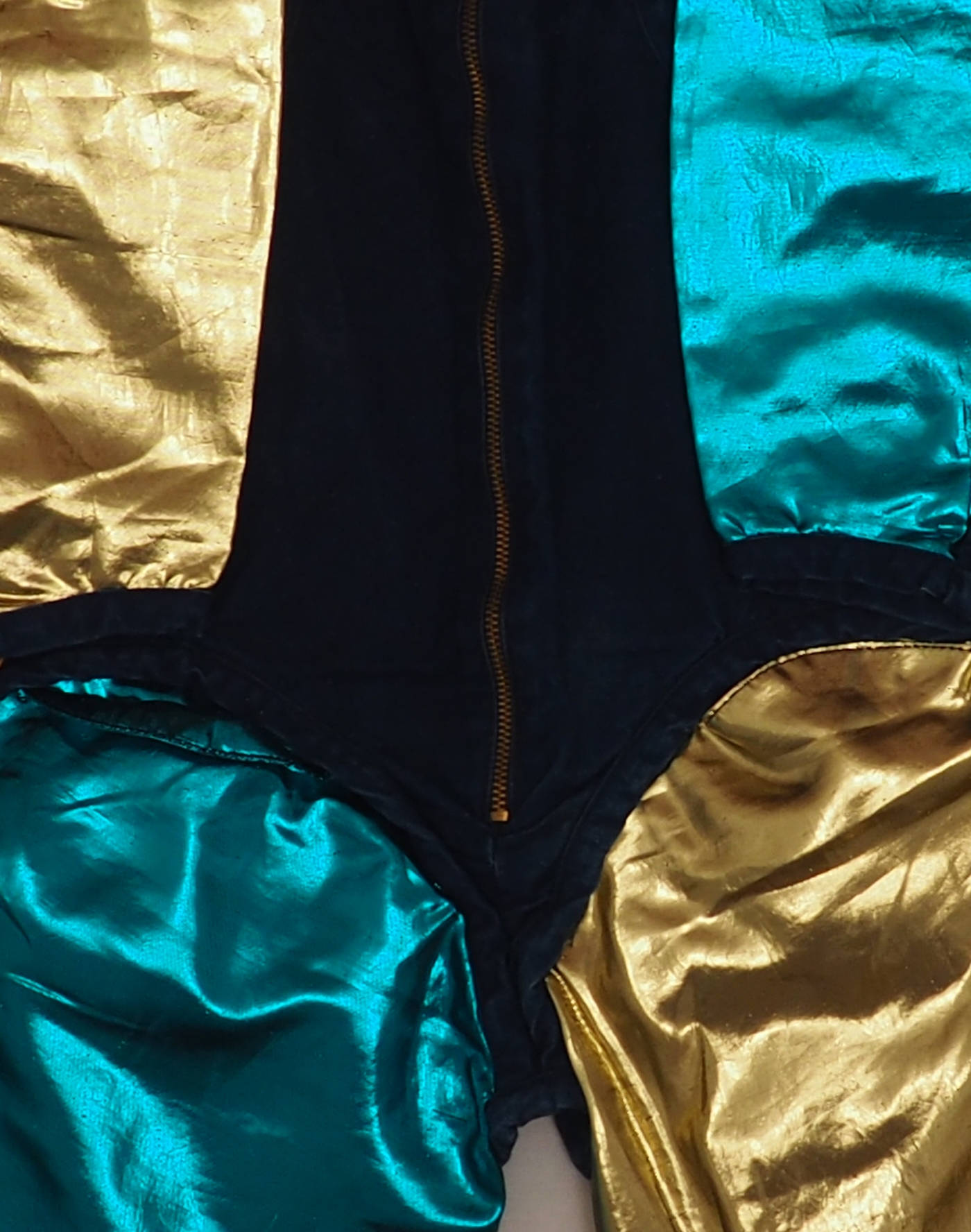 Trotinette, la marque d’avant-garde pour les petits des années 1980. Incroyable combinaison futuriste indigo avec manches et jambes en matière lamée doré & bleu. Serigraphie robots & planètes dans le dos. Deux poches sur les jambes, coupe invraisemblable, fermeture éclair devant. Une pièce de musée pleine de détail de couture. Fabriquée en France, très bon état, tissu 65% coton, 35% polyester.