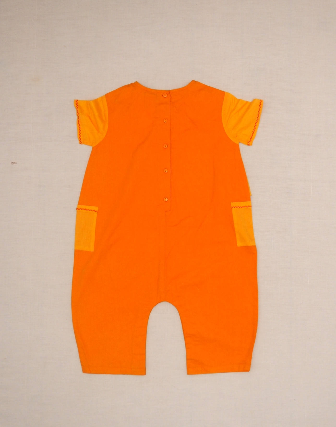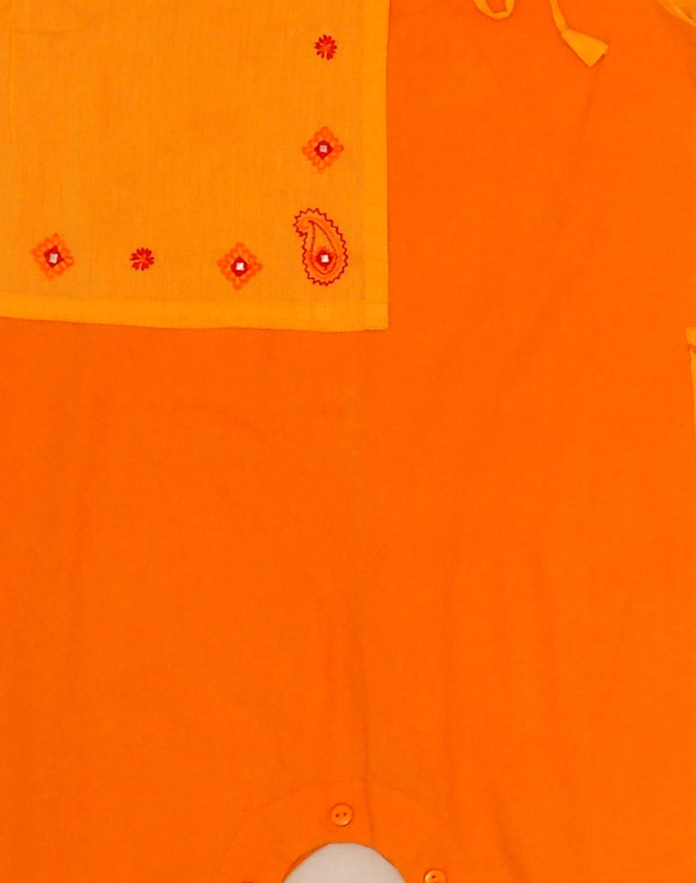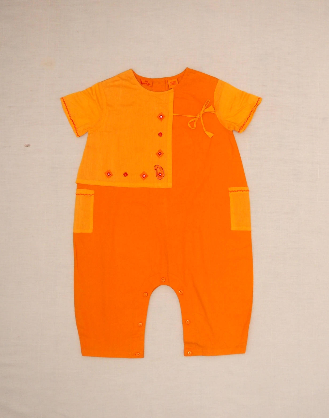 Magnifique combinaison en coton léger orange avec pan contrastant brodé sur le buste noué par une petite bride. Deux poches sur le côté, fermée par cinq boutons dans le dos, sept boutons à l’entrejambe. Bon état mais quelques petites taches de décoloration dans le dos, d’où le petit prix. 100% coton.