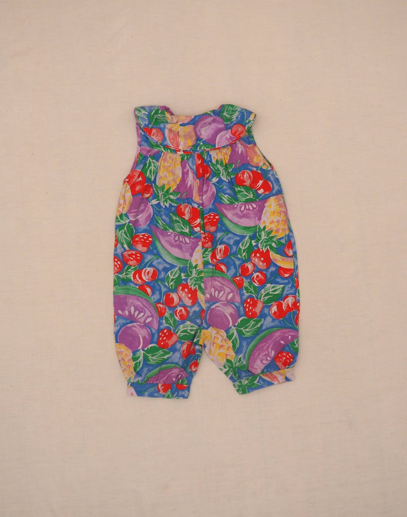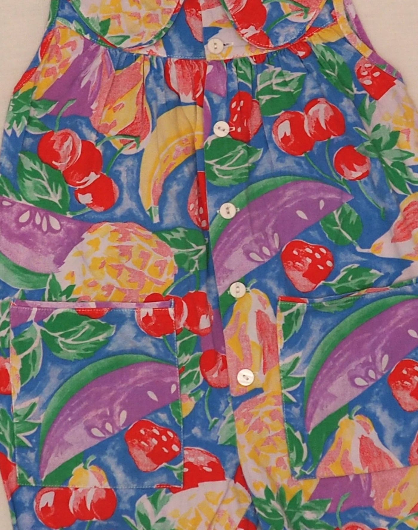 Belle combinaison d’été sans manches en coton léger à motif fruits, grand col rond, deux poches plaquées devant, fermée par six boutons. Fabriquée en France, très bon état, 100% coton.