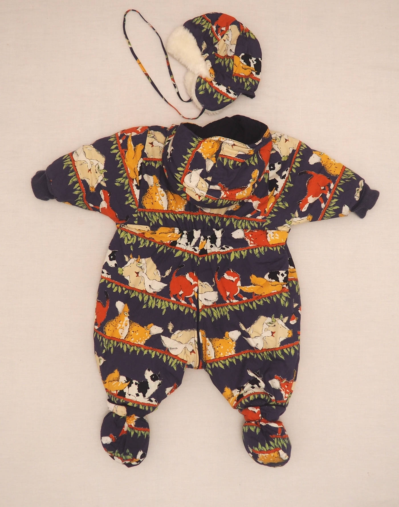 Catimini vintage. Incroyable combinaison d’hiver à capuche bleu marine imprimé animaux, chaussons détachables, chapka assortie. Entièrement doublée et molletonnée. Très bon état, tissu 100% coton, fabriquée au Maroc