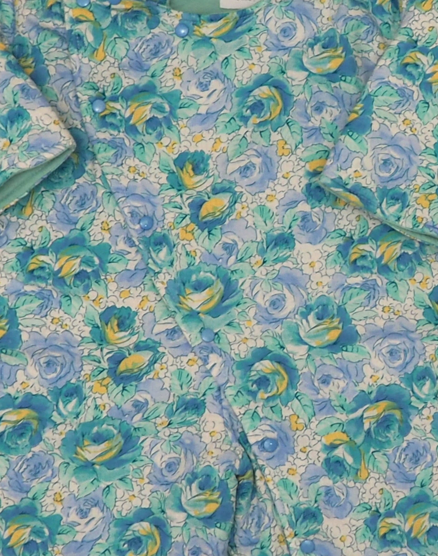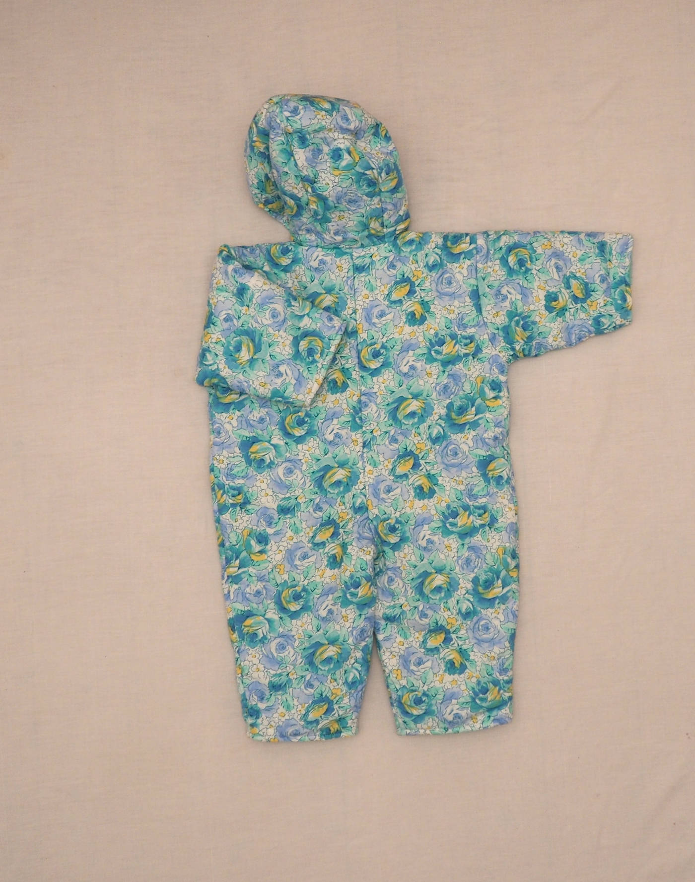 Très belle combinaison d’hiver entièrement doublée et molletonnée en coton fleuri à capuche, fermeture en biais jusqu’au bas de jambe par dix boutons pression. Doublée en jersey bleu turquoise. Très bon état en dehors d’une très légère usure de la peinture des boutons, 100% coton.