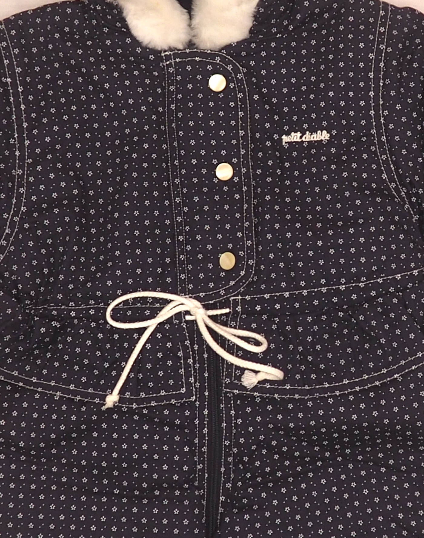 Splendide combinaison d’hiver en tissu bleu marine à imprimé petites fleurs blanches, entièrement molletonnée et doublée. Capuche bordée de fausse fourrure blanche. Volant sur la taille avec cordon à nouer. Fermeture éclair devant avec rabat boutonnée par trois boutons nacrés. Etat neuf avec étiquette, 100% coton.