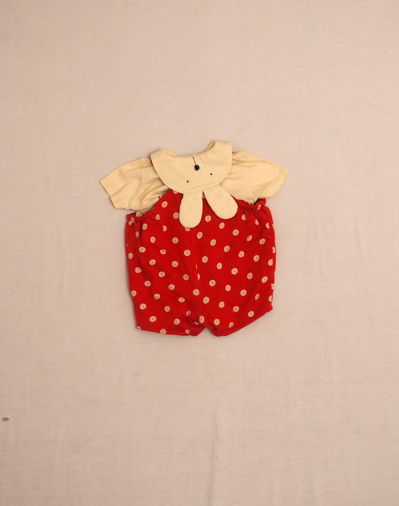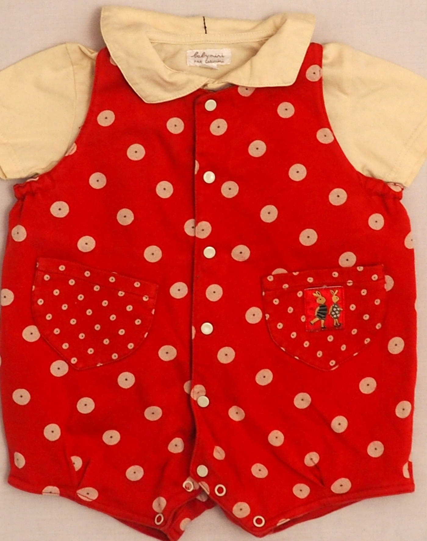 Incroyable ensemble en jersey composé d’une barboteuse rouge à pois, deux poches plaquées devant dont l’une ornée d’un petit patch lapin, bretelles croisées et cousues dans le dos, fermée devant par six boutons pression, quatre boutons pression à l’entrejambe, et d’une chemisette assortie avec imprimé petits lapins devant, col avec des oreilles dans le dos (!), fermée par quatre boutons. Très bon état, 100% coton.