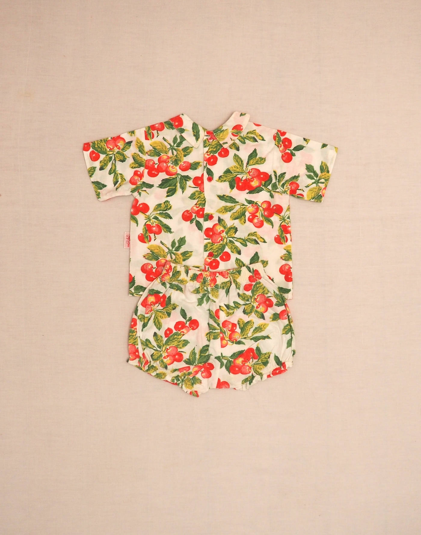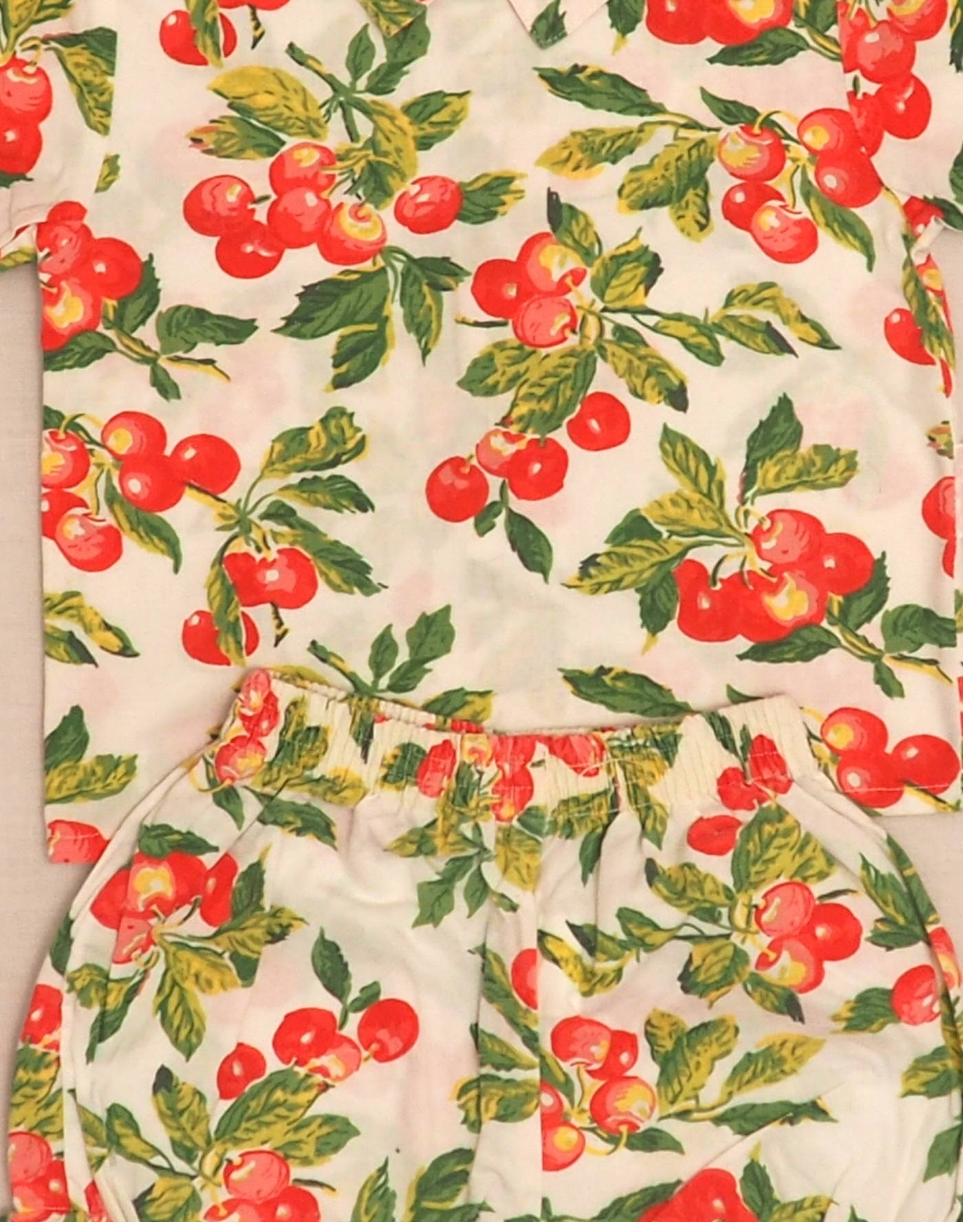 Ensemble printanier en coton imprimé cerises, composé d’une blouse à manches courtes, col claudine, fermée dans le dos par quatre boutons, et d’un bloomer assorti avec élastiques à la taille et aux cuisses. Très bon état, 100% coton.