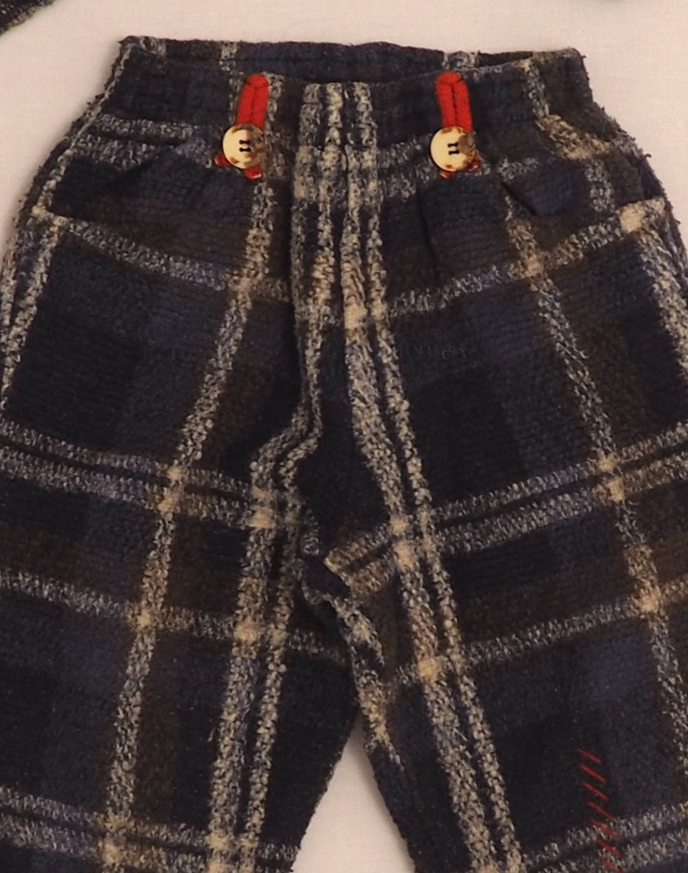 Très beau pantalon d’hiver effet polaire à motif carreaux, taille élastique, deux poches devant, deux poches plaquées derrière, boutons décoratifs à la taille, bonnet assorti avec deux brides boutonnées à nouer. Fabriqué en France, très bon état, tissu 40% coton, 30% polyester, 30% acrylique.