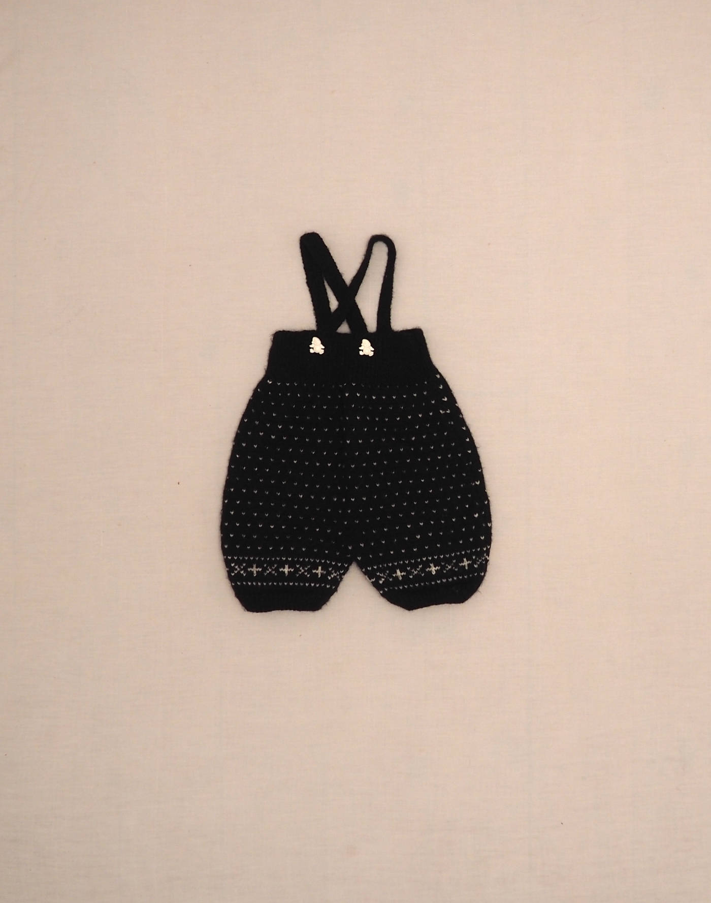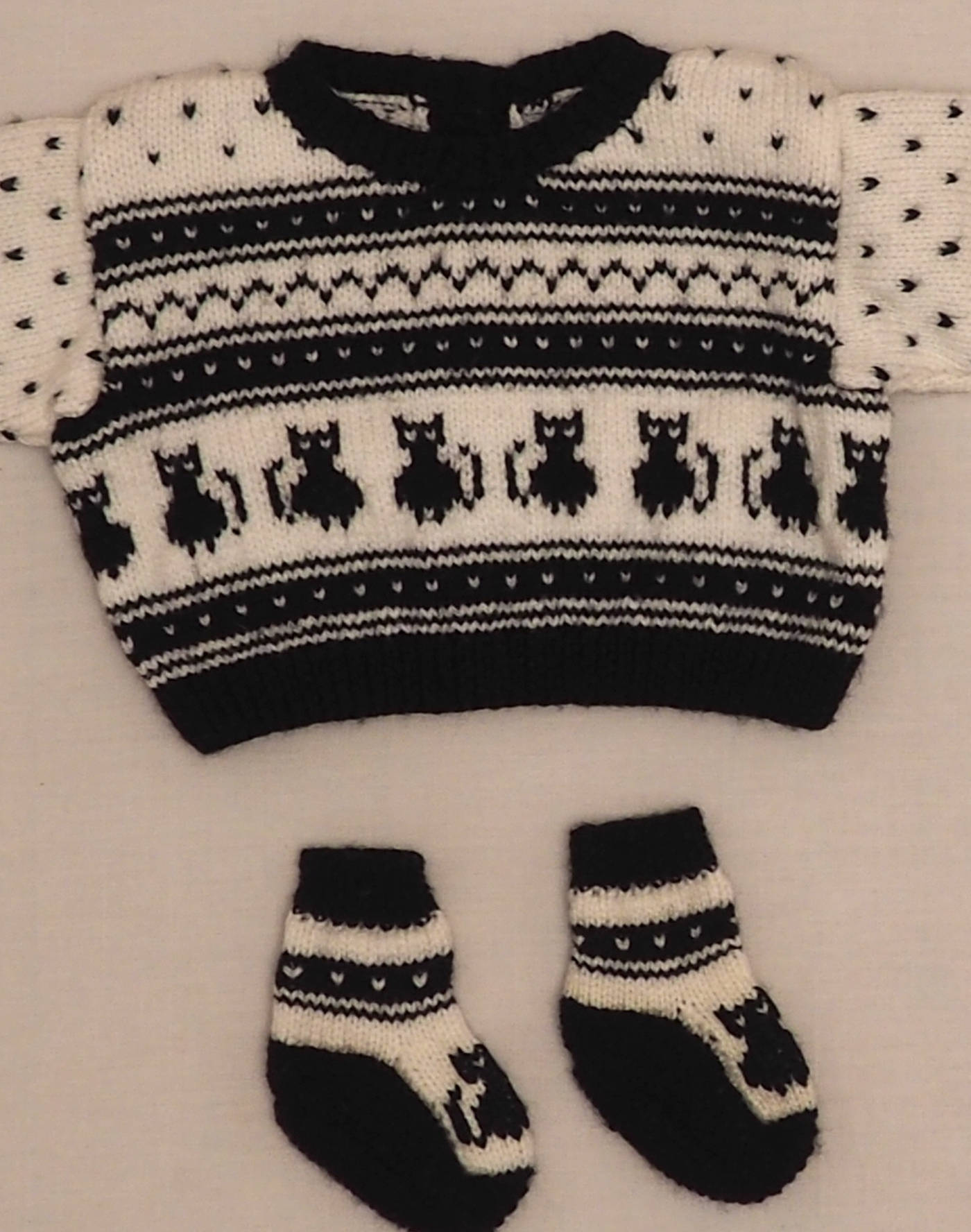 Pièce tricotée main. Magnifique ensemble en maille noir & blanc composé d’un pull en jacquard motif chat fermé dans le dos par trois boutons, pantalon à bretelles assorti avec bretelles attachées devant par deux boutons pingouins, chaussons jacquard « chat » assortis. Très bon état, toucher laine douce.
