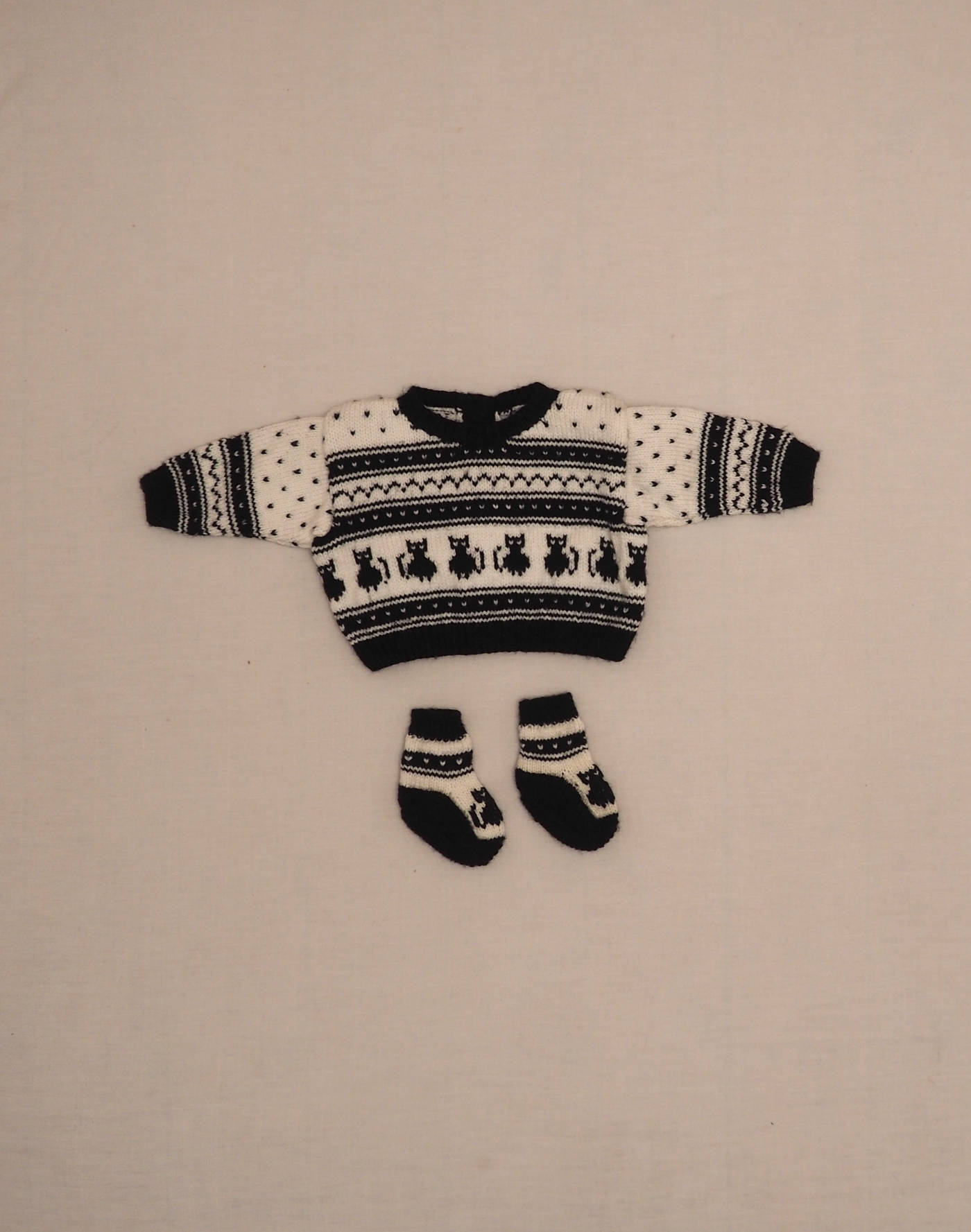 Pièce tricotée main. Magnifique ensemble en maille noir & blanc composé d’un pull en jacquard motif chat fermé dans le dos par trois boutons, pantalon à bretelles assorti avec bretelles attachées devant par deux boutons pingouins, chaussons jacquard « chat » assortis. Très bon état, toucher laine douce.