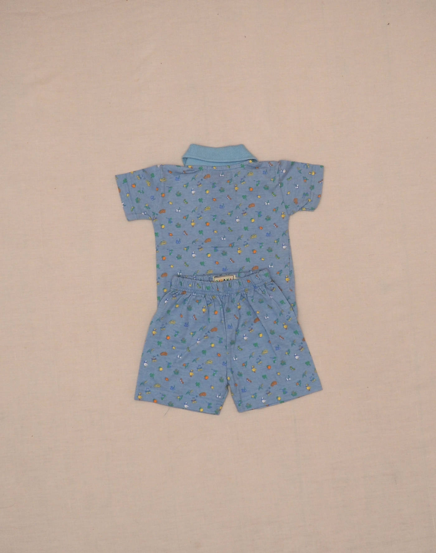 Adorable ensemble en jersey bleu ciel imprimés de petites fleurs & animaux, composé d’un polo à manches courtes fermé par deux boutons et d’un short assorti à taille élastique. Très bon état, 100% coton.