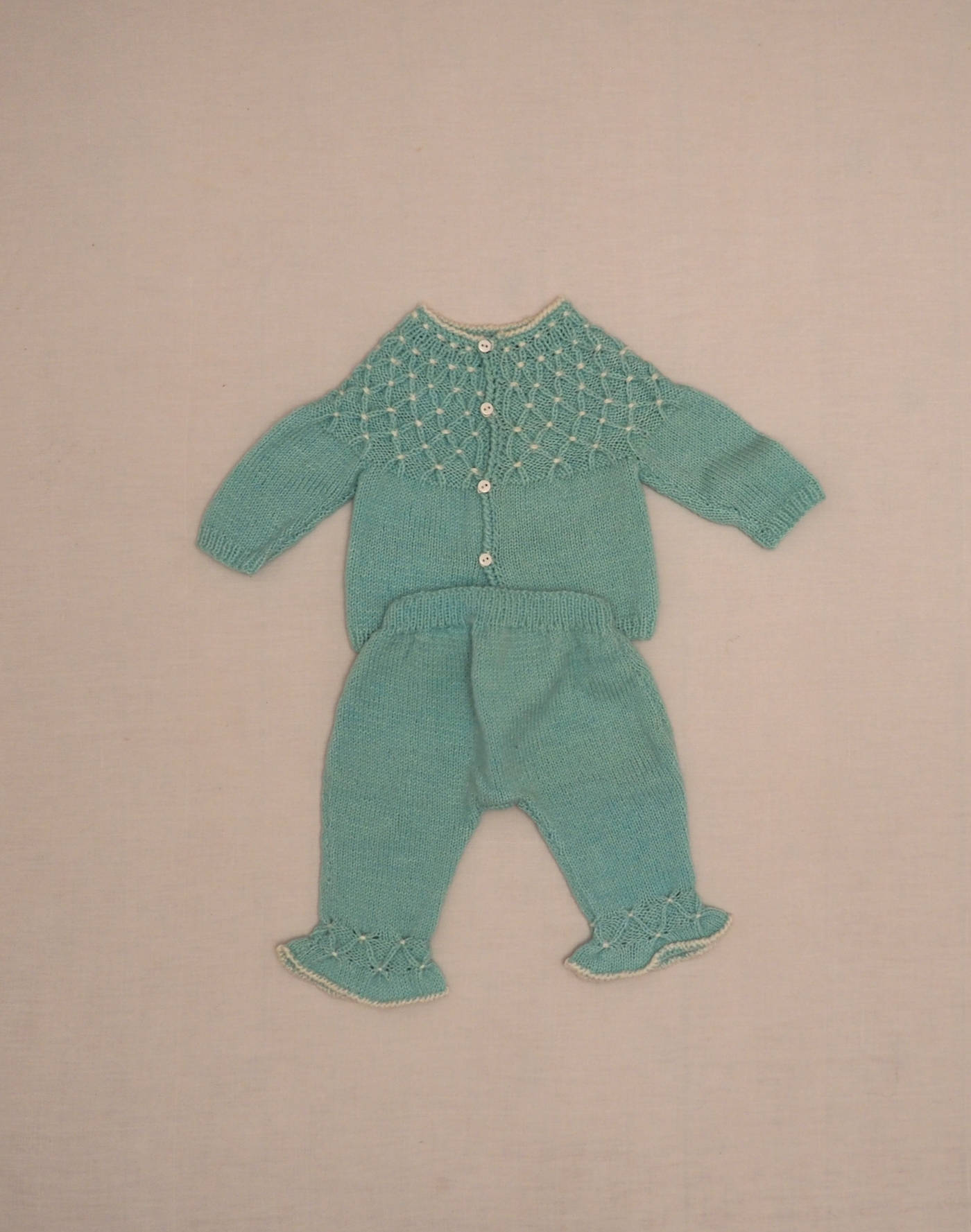 Pièces tricotées à la main, années 1960. Magnifique ensemble en maille bleu clair composé d’un pull ou cardigan (les boutons peuvent être portés devant ou dans le dos) avec joli point de tricot brodé sur le buste, et d’un pantalon assorti « pattes d’eph » avec le même point sur le bas de jambe, taille élastique. Très bon état, toucher laine douce.