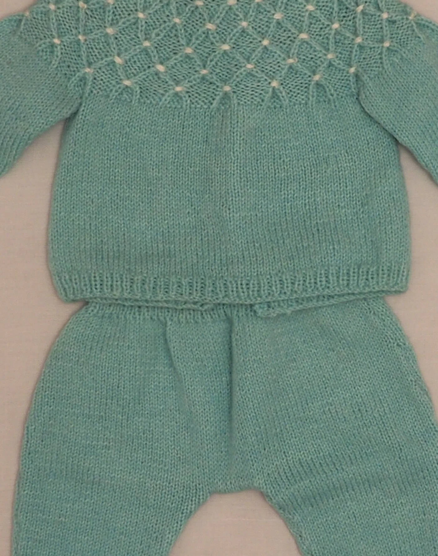 Pièces tricotées à la main, années 1960. Magnifique ensemble en maille bleu clair composé d’un pull ou cardigan (les boutons peuvent être portés devant ou dans le dos) avec joli point de tricot brodé sur le buste, et d’un pantalon assorti « pattes d’eph » avec le même point sur le bas de jambe, taille élastique. Très bon état, toucher laine douce.