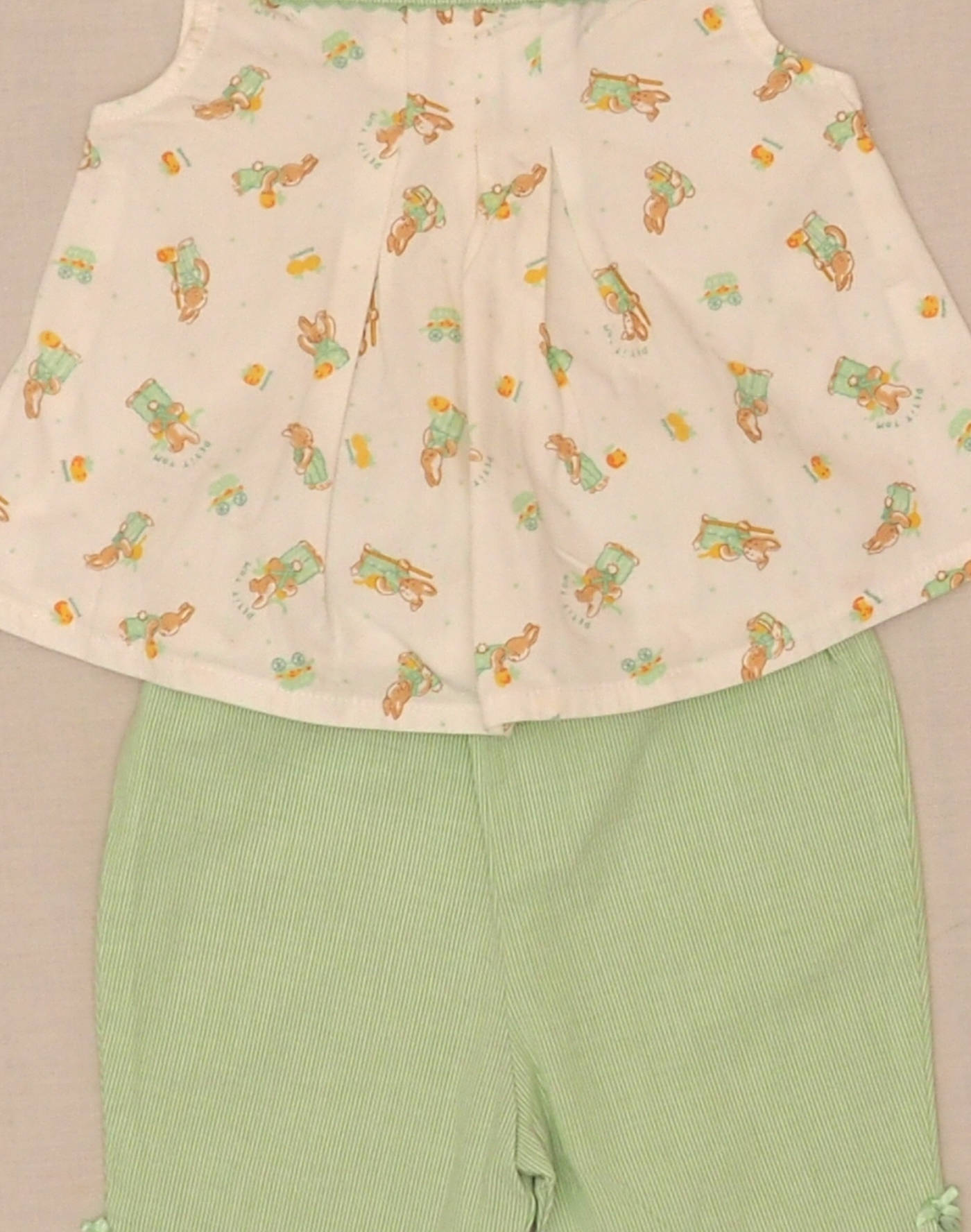 Ravissant ensemble d’été composé d’une blouse sans manches à motif petits lapins avec pinces sur le buste, col constrastant rayé décoré de trois petits noeuds, fermée dans le dos par trois boutons en forme de fleurs, pantalon rayé assorti, taille élastique, croquet et noeuds sur le bas de jambe. Très bon état, 100% coton.