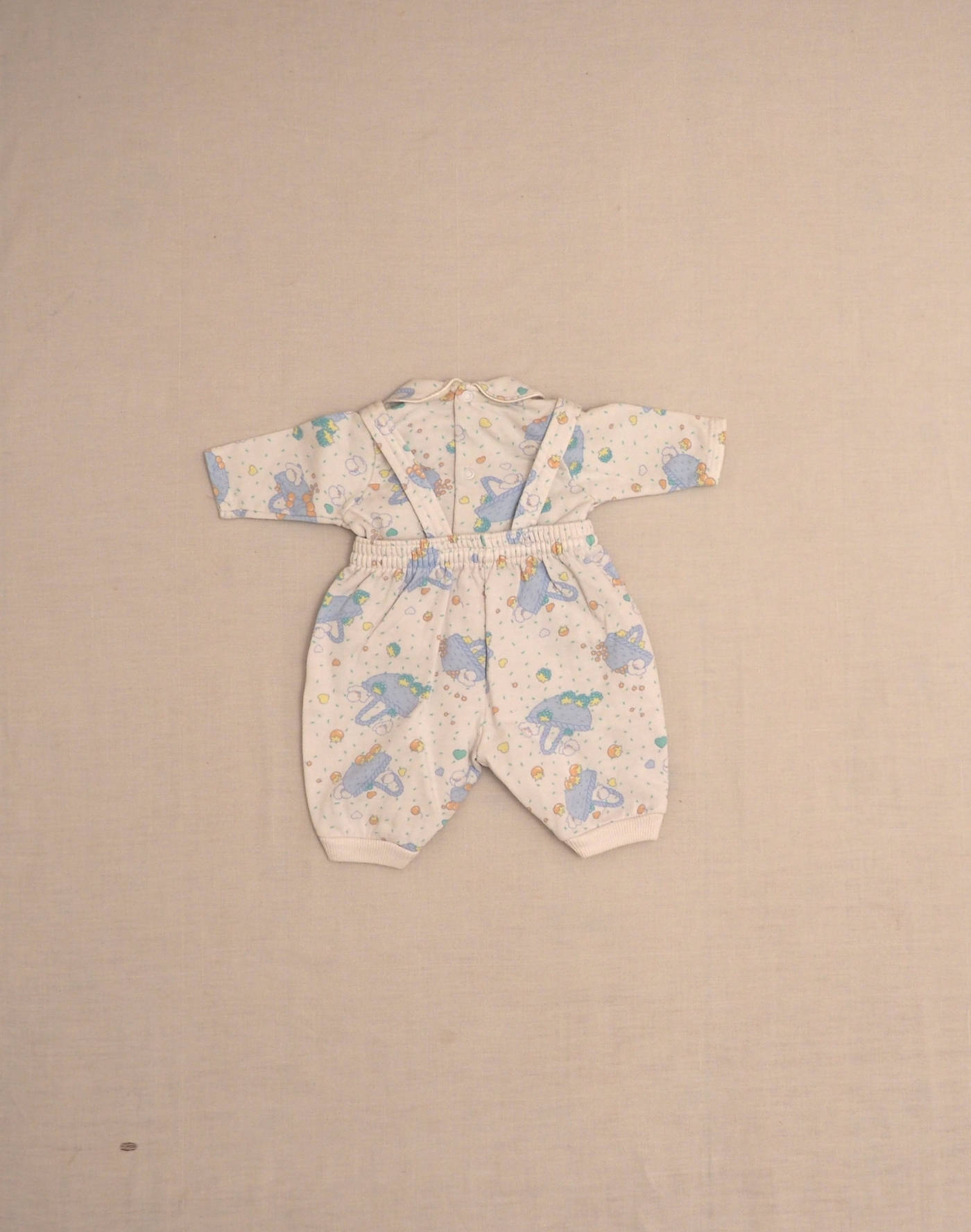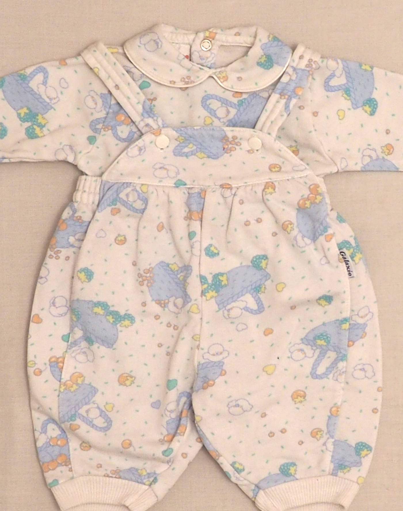 Adorable ensemble en jersey imprimé motif paniers & oiseaux, composé d’une salopette taille élastique, bretelles attachées devant par deux boutons, et d’une blouse à manches longues, petit col, fermée dans le dos par quatre boutons pression. Très bon état, 100% coton.