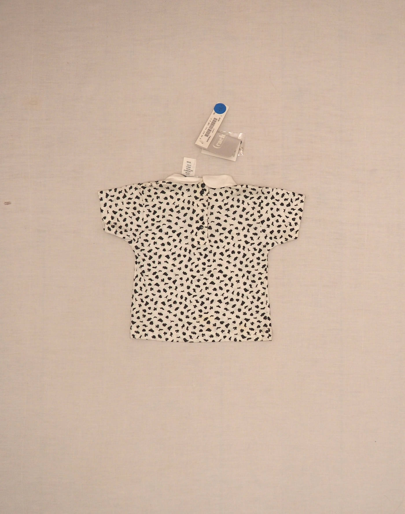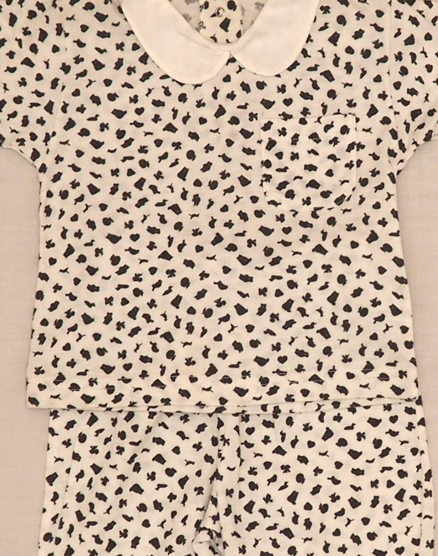Cacharel vintage, neuf avec étiquette. Charmant ensemble en jersey très doux blanc à motifs animaux et noir, composé d’un T-shirt avec col, une poche sur le buste, fermé dans le dos par quatre boutons pression, et d’un short long assorti, taille élastique. Etat neuf, 100% coton.