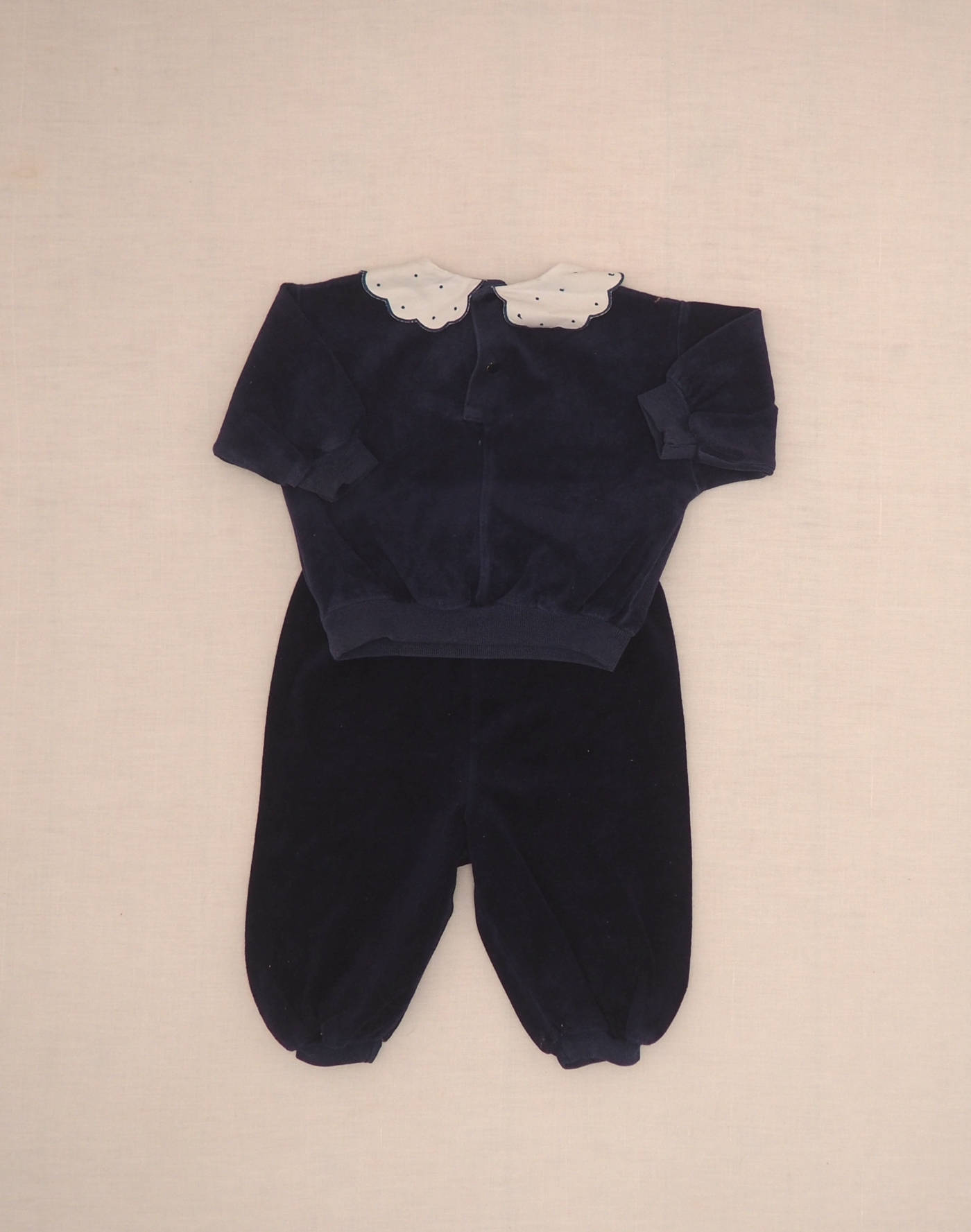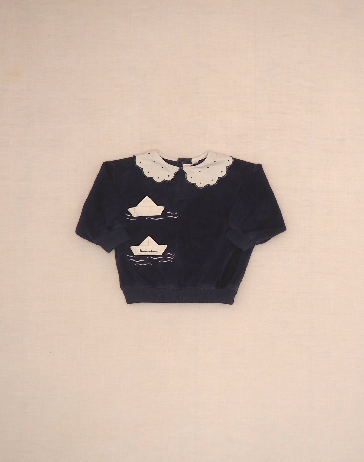 Incroyable ensemble en jersey de velours bleu marine composé d’un sweatshirt avec appliqué bateaux en tissu sur le buste, col blanc brodé. Fermé dans le dos par deux boutons pression, et d’un pantalon assorti avec taille élastique. Fabriqué en France, très bon état, pas d’étiquette de composition.