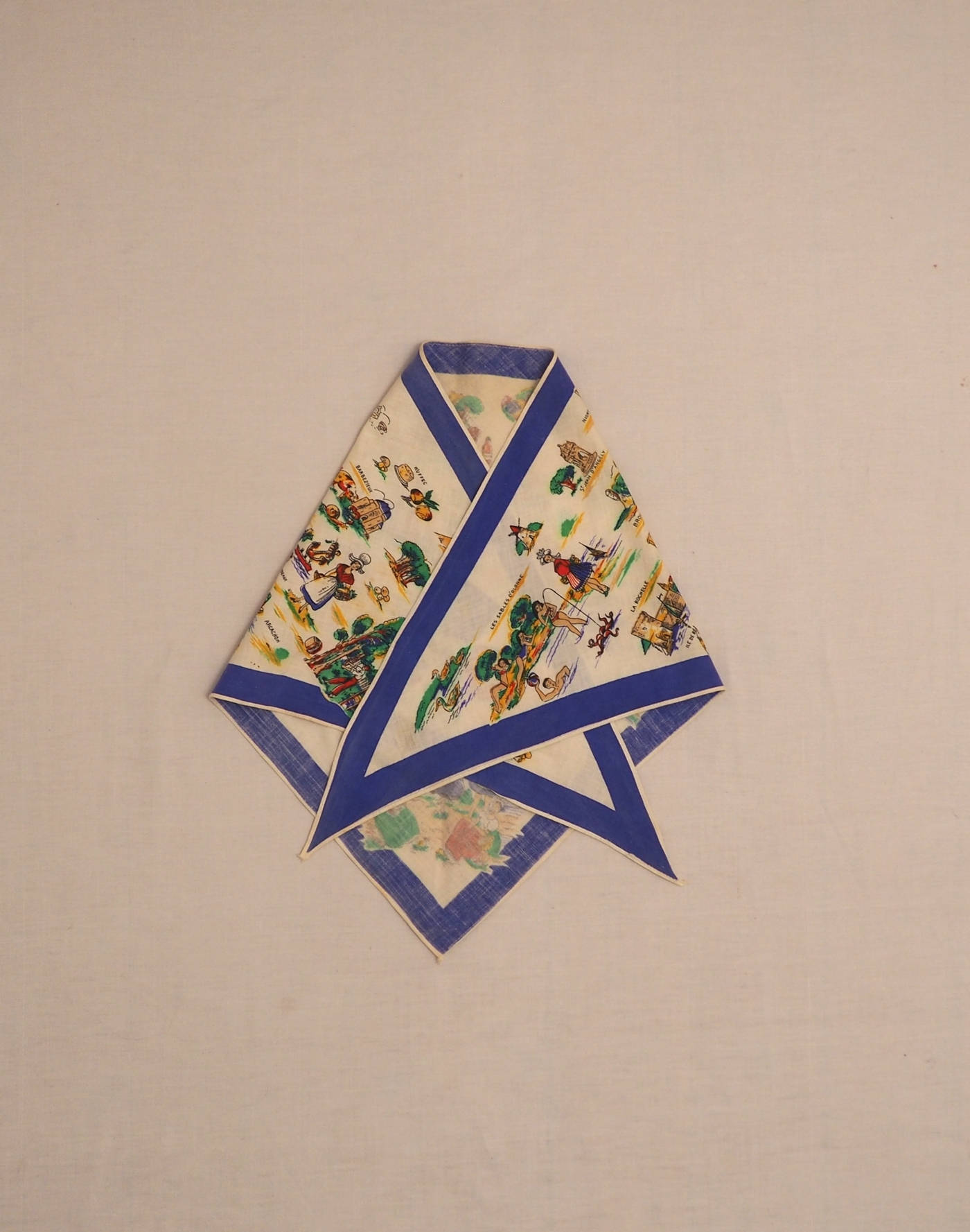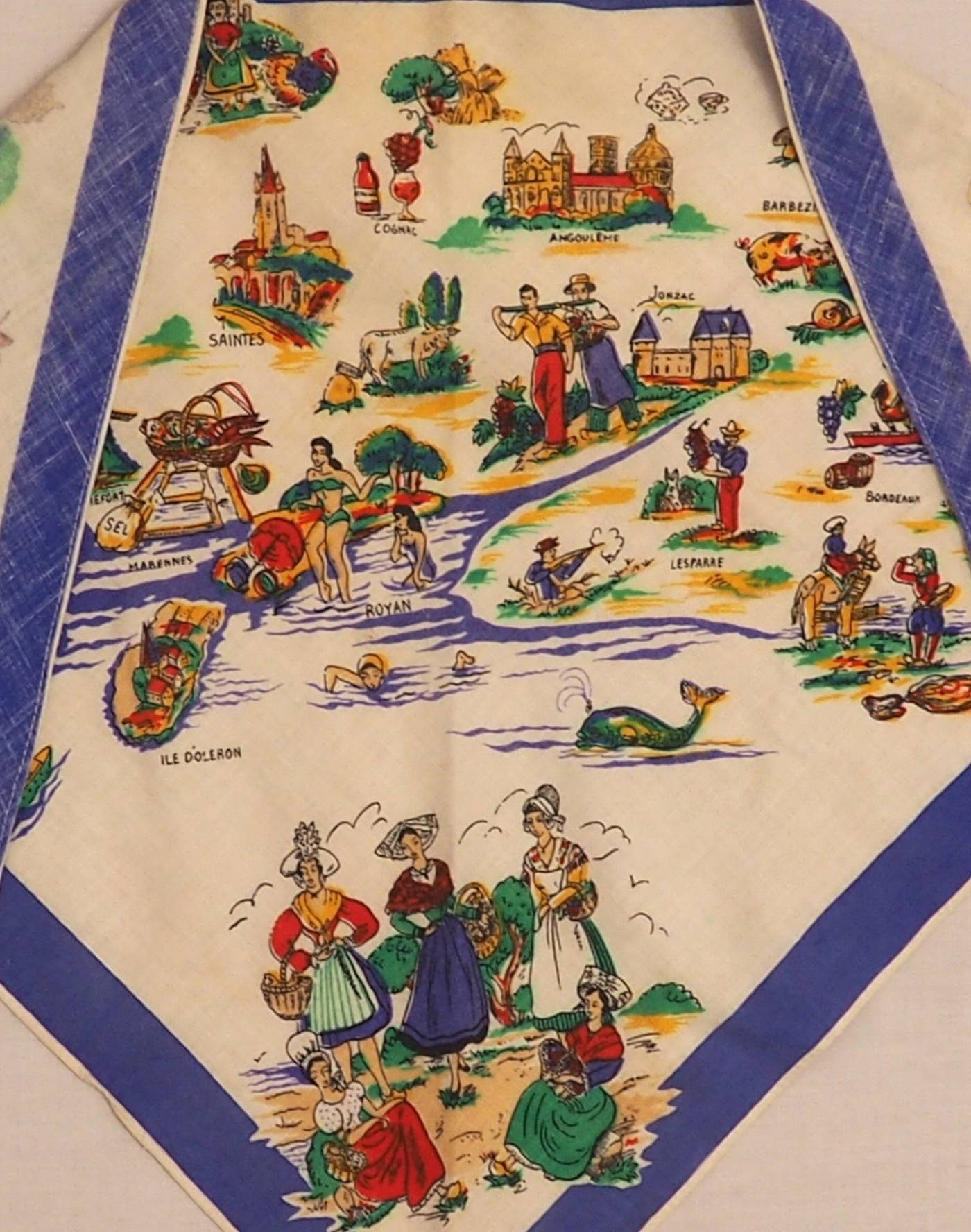 Années 1950. Magnifique foulard triangle imprimé villes de Charentes, très probablement en coton. Très bon état.