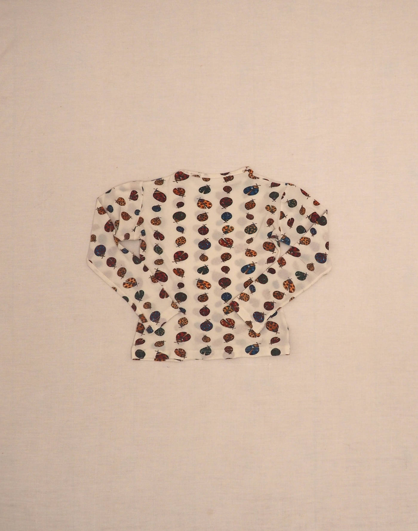 Joli T-shirt à manches longues en mesh blanc avec imprimé coccinelles multicolores. Très bon état, tissu acétate.